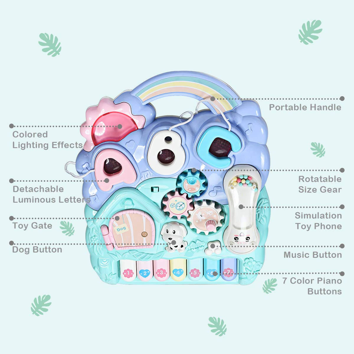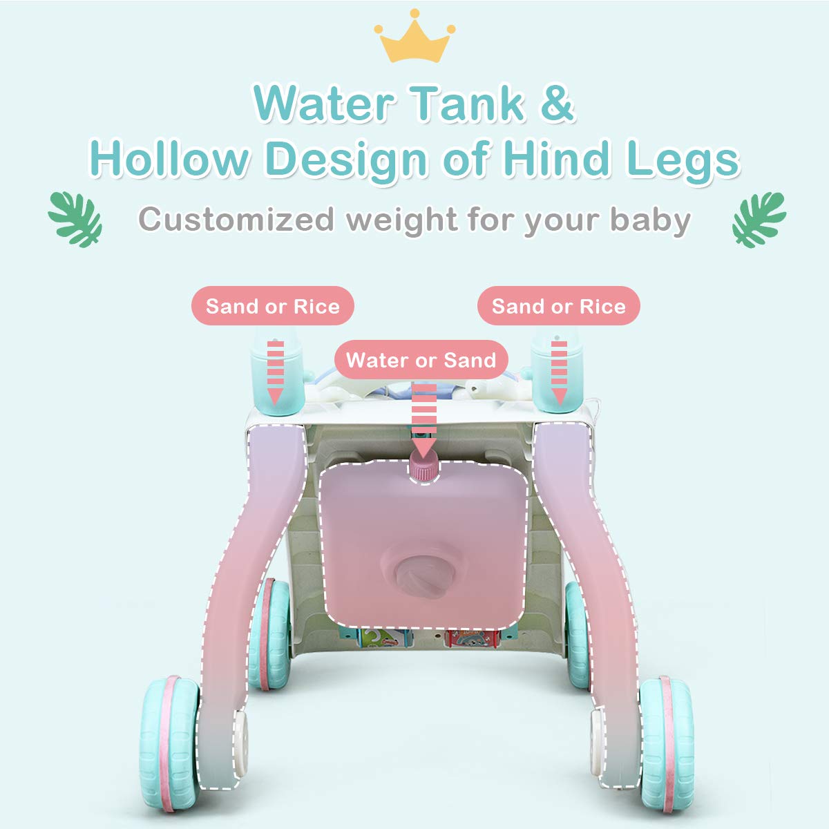 Description: BABY JOY sit-to-stand baby learning walker is the best helper for babies learning walking in early development. The stable triangular structure gives the walker excellent resistance to pressure and load bearing. Equipped with a water tank on the back, this professional baby walker effectively reduces its center of gravity to prevent rollover. And the non-slip handles and tires ensure the safety of your baby. The detachable play panel with various instruments, shape sorter with lights fully exercises babys hand-eye coordination. It is your babys wonderful childhood partner! Features: Cultivate childrens musical interest with various songs and instrument Increases the stability of the car with the water tank on the back Triangular structure is very durable and stable for your safe use Exercise childs leg muscles and promote tactile development Widening the board spacing to accommodate the childs feet Rear wheel with adjustable speed system for babies in various growth phases Multiple cute buttons to attract your childs attention Support wood and slab flooring with non-slip tires Detachable panel for playing in bed or outside Non-slip tires to protect floor 3 uppercase letters with lighting effects Fully tested with ASTM Specification: Color: Baby Blue Material: ABS + PT Product Dimension: 13 x 19 x 20 (L x W x H) Front Wheel Length: 13 Rear Wheel Length: 16.5 Suitable Age: 0+ Net Weight: 6 lbs Package includes: 1 x Baby Walker