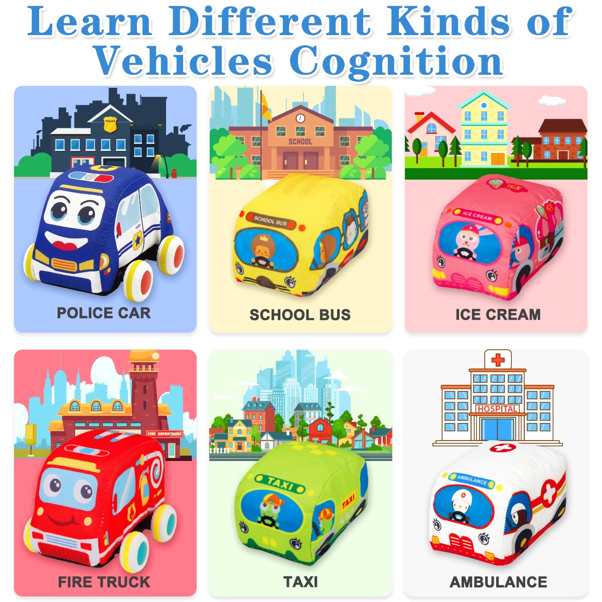 6 Fun and Plush Designs What you get: Comes with 6 different toy vehicles with a storage bag, each super soft and with a fun and friendly personality. Soft Baby Toys and endless racing joy with your loved ones. PLAY BY YOURSELF OR WITH FRIENDS 2 in 1 play mat/ storage bag With urban traffic scene on the play mat the cars can go on track while kid push it. And it can be folded into a storage bag to storage cars with Velcro, compact size-Portable for indoor outdoor and travel. Take the fun anywhere Baby can go to town anytime, anywhere, with this town-themed play mat and vehicle set! The soft, washable fabric mat has an anti-slip backing to help keep it in place on any surface. The set includes nine soft, cloth-covered vehicles that are easy to grip and manipulate, and that squeak, rattle, and shake for added play and learning value. The mat folds conveniently into a storage bag for the vehicles; the built-in handle makes it a perfectly portable activity for anytime! The best choice for gifts Babies can learn to share their pull back toy cars and interact with other friends and family members. Tons of ways to play and endless hours of fun. babies and parents/friends can race together in the house, who will be the winner of the house, just pull it back, we will find out. A perfect Christmas Gift for your little one.