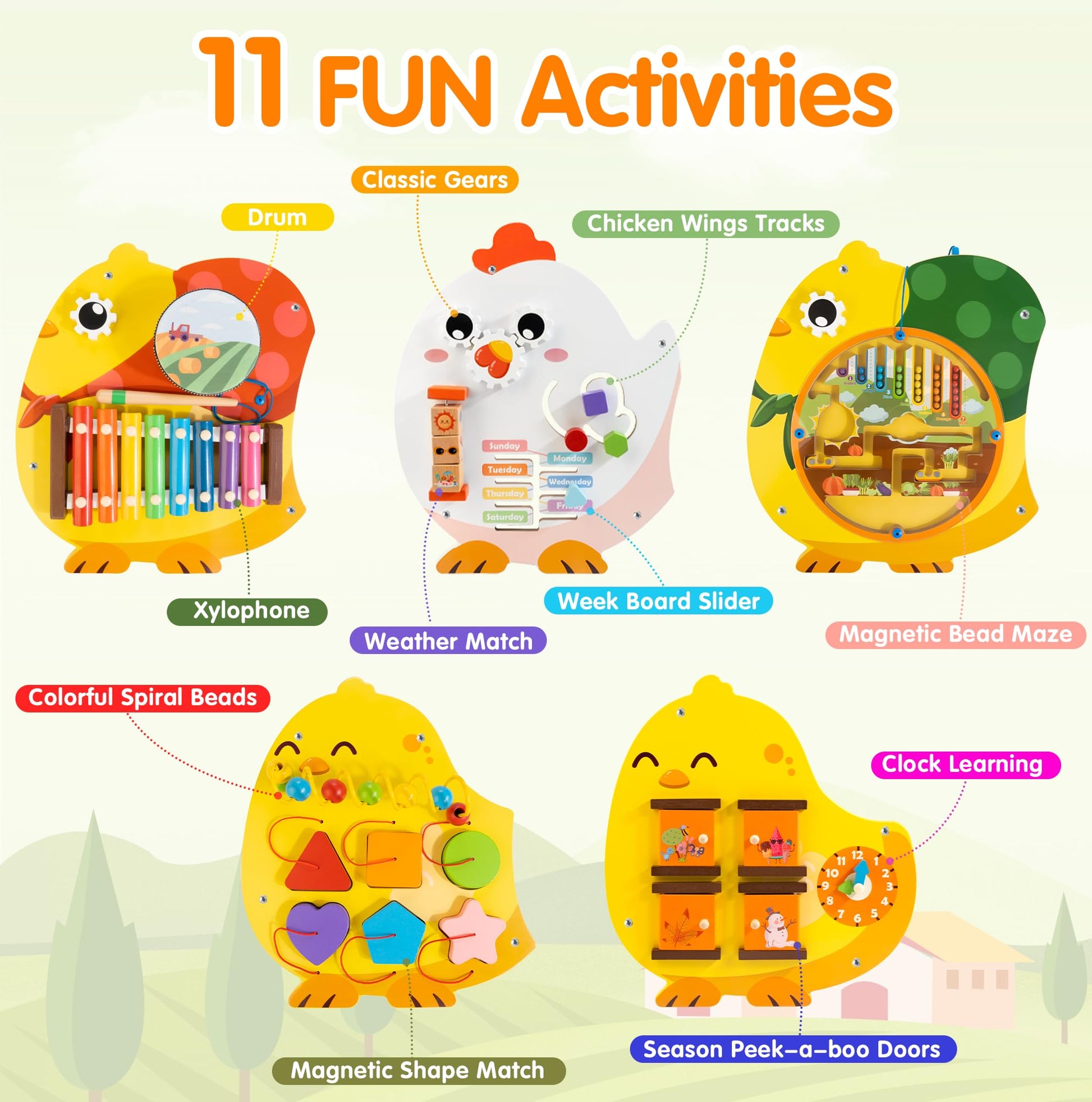 - Q: How many activities are included in the Chick Squad Activity Wall Panel? A: The activity wall panel features 11 unique Montessori-inspired activities that help children learn about colors, shapes, numbers, and motor skills, providing a comprehensive sensory experience.