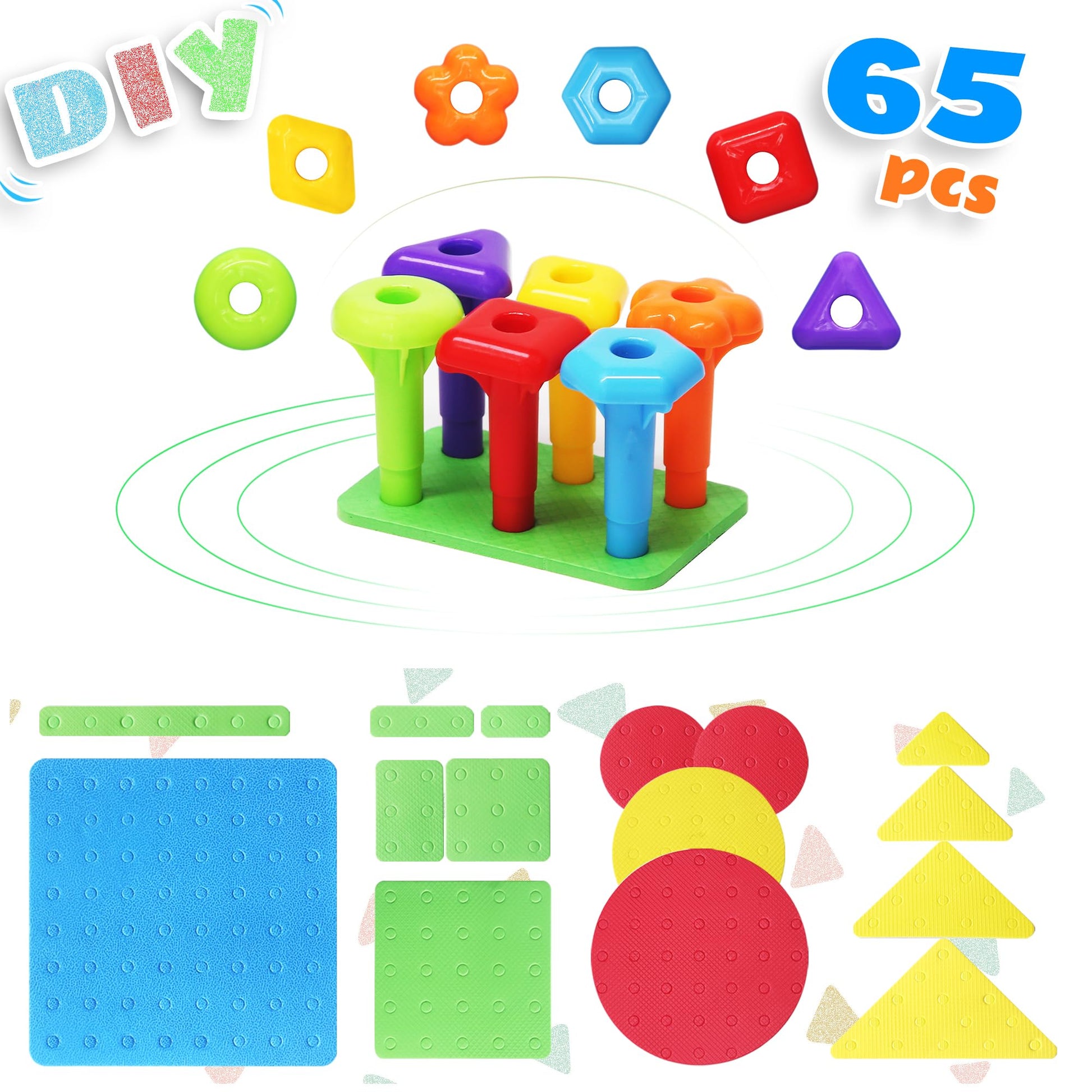 65pcs pegboard toys: A large number of foam pegboard toys, respectively, with 6 colors and 6 shapes of nails, 3 shapes of foam board. Large quantities can be freely assembled into various shapes. Educational preschool toys: Great school supplies, essential for teachers, to develop childrens creative imagination, design skills, and scientific construction thinking. Good Threading toys, a counting game that can be strung together. Fashion design: Wonderful color matching, high and low DIY stacked toy mode, with excellent color three-dimensional effect, and mushroom garden toys,Lacing String Game Upgraded version safety: The upgraded plastic pegboard toy, each part does not have sharp corners, great hand feel so that childrens fingers are comfortable, the product has passed the international testing and certification CPSIA and ASTM Intimate after-sales service: the product is allowed to leave the factory after 3 times of quality inspection. If you have any questions, you can contact the after-sales team in the station for consultation to solve your concerns.