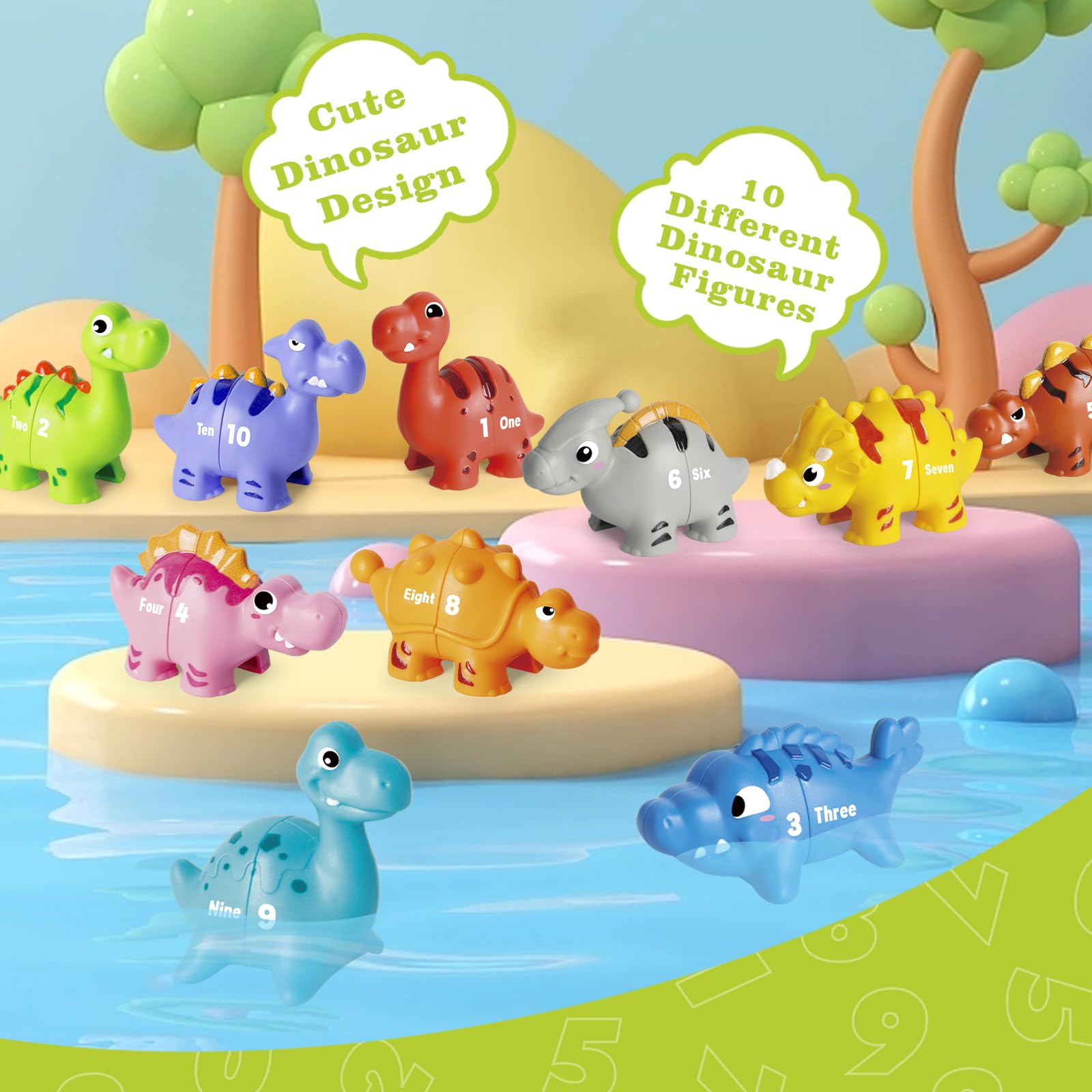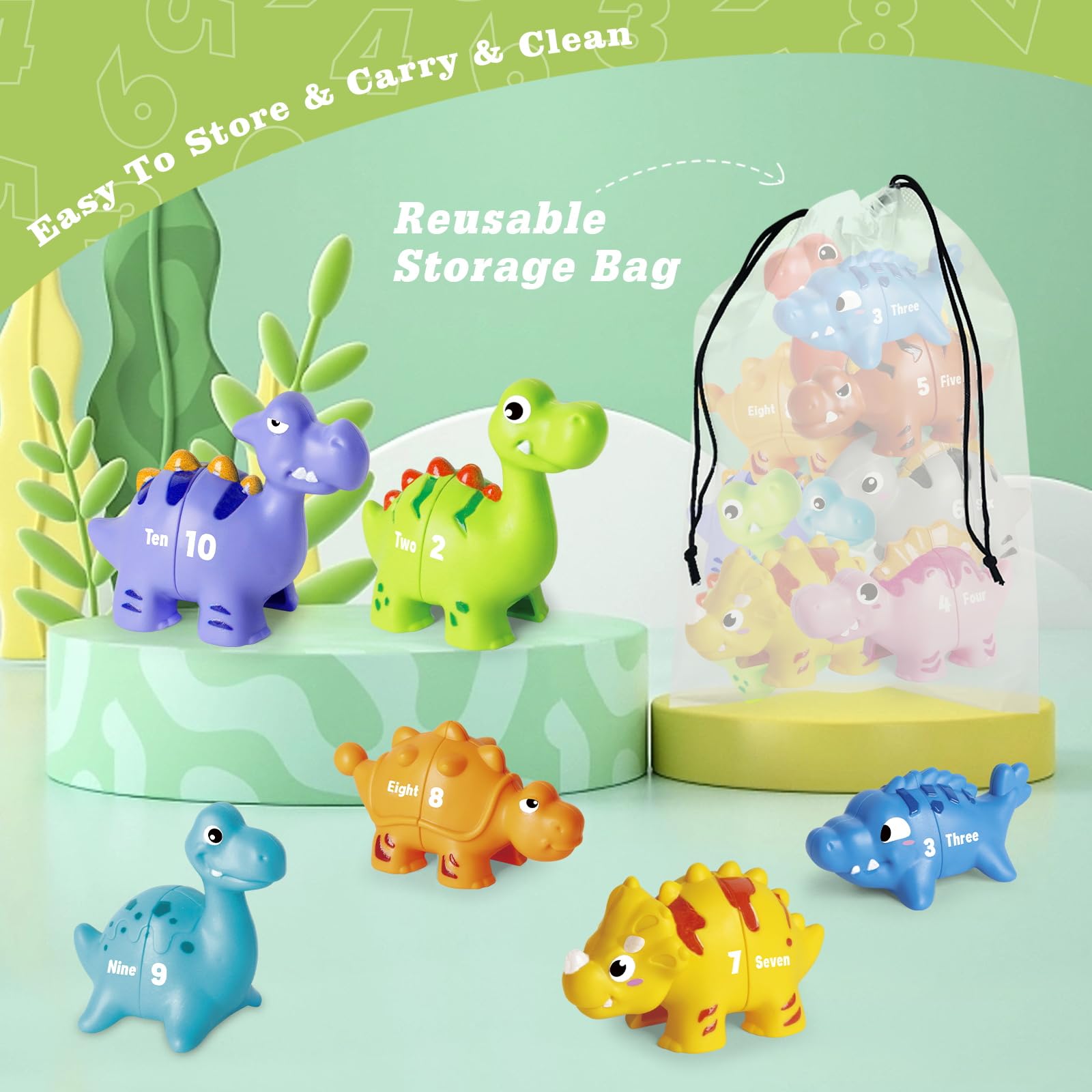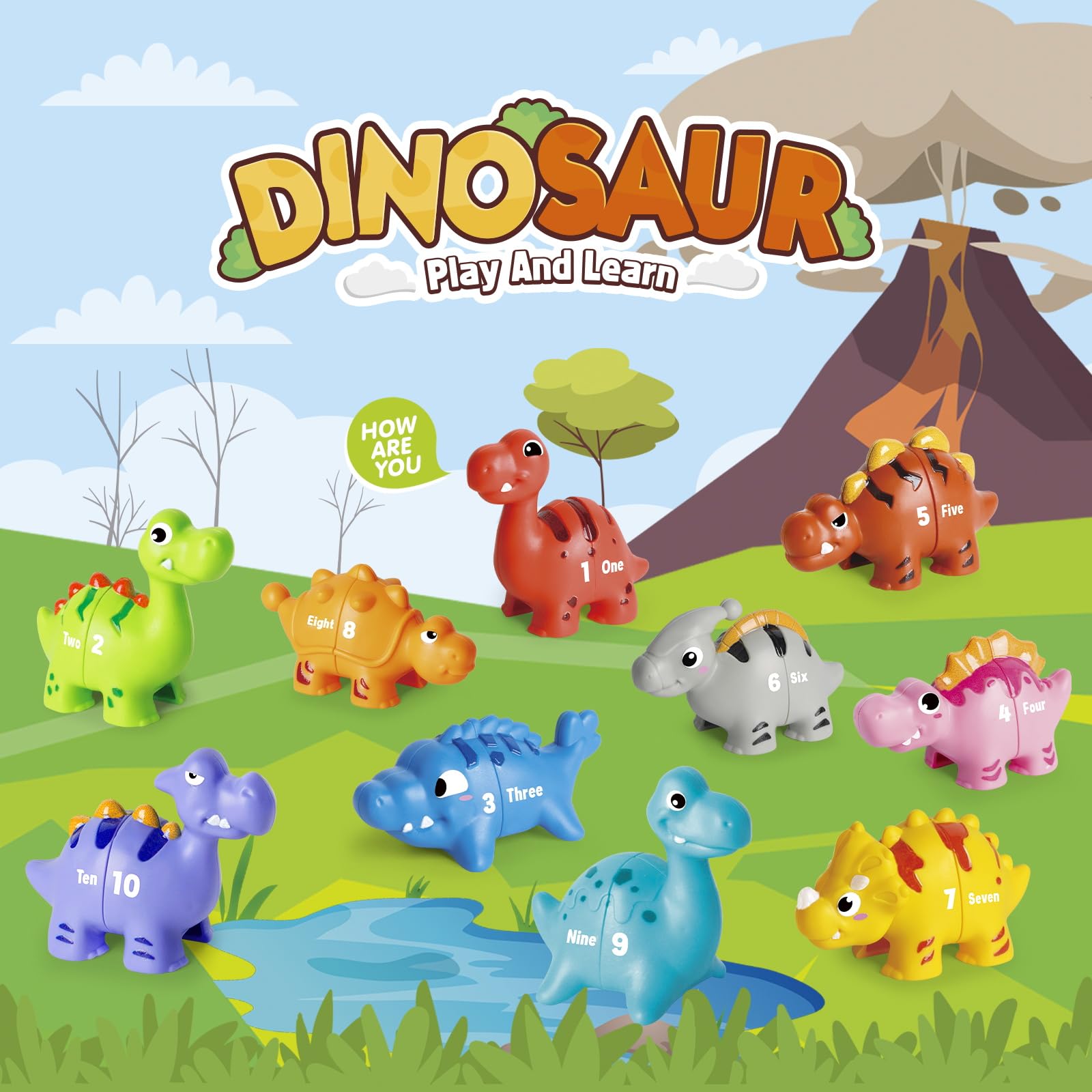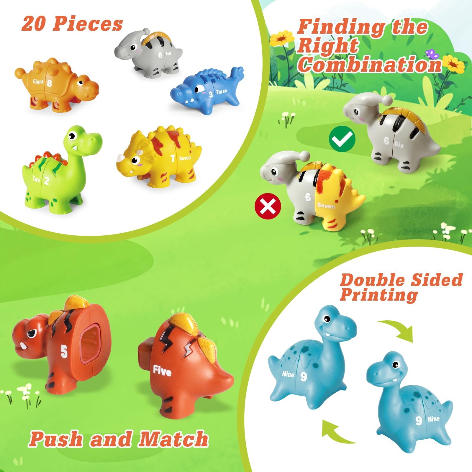 HAPPYMATE 20 PCS Dinosaur Number Learning Toys for Toddlers 2-4, 10 Different Dinosaur Figures, Double Sided Number Matching Gam