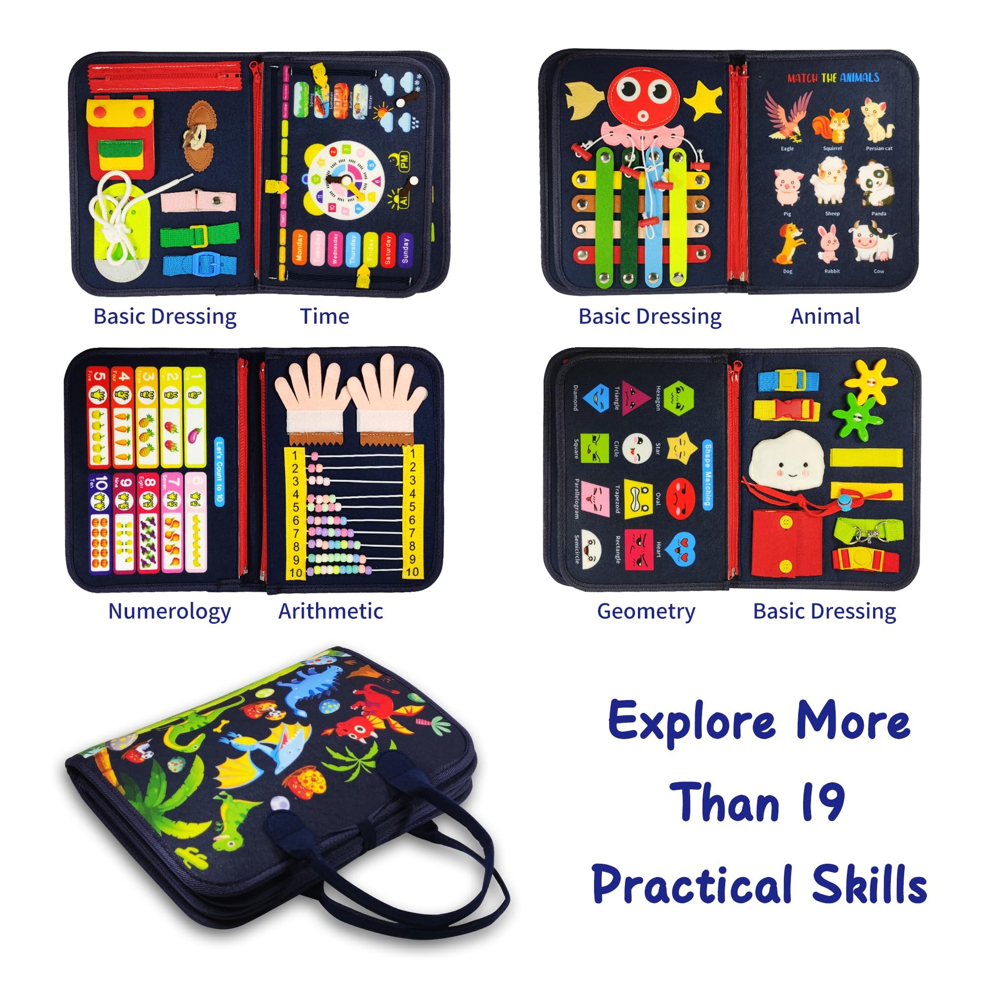 Multi-Functional Activity Board - This innovative busy board features 8 pages of engaging activities, including zippers, shoelaces, belts, buttons, clocks, calendars, shape matching, and puzzles. It captivates toddlers for hours and helps them develop essential skills through play | Learn While Playing - Activities like the Octopus button page improve hand-eye coordination, while the clock and calendar pages enhance cognitive development. Shape matching and jigsaw puzzles boost recognition and imagination, and the letter and number threading games support spelling and number learning | Safe & Portable Travel Toy - Made from non-toxic soft fabrics and felt, this board ensures safety and reliability. Equipped with a handle, it's easy for toddlers to carry and fits in most diaper bags or school bags, making it perfect for car trips, airplane travel, or quiet playtime | Well-Designed & Easy to Use - Designed for little hands, this Montessori toy is sturdy and durable, with securely attached parts. Parents can join in to teach spelling, counting, and matching, making it an excellent tool for preschool learning and a great alternative to screen time | Perfect Gift & Satisfaction Guaranteed - This Montessori busy board features a cute design with animal alphabets and makes an ideal gift for children aged 1 to 4. It