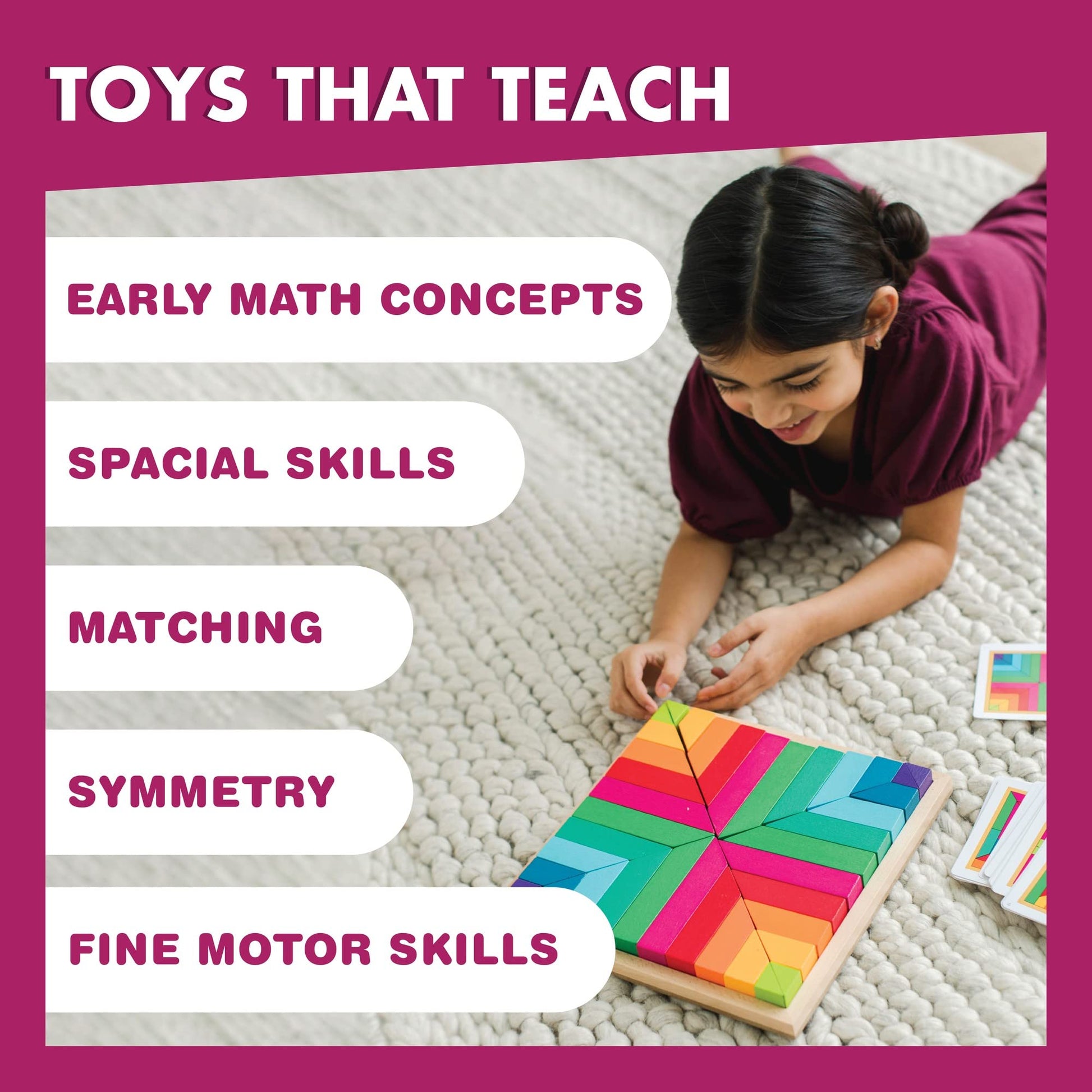 TOYS THAT TEACH: Use these brightly-colored blocks in varying shapes and the pattern cards to introduce significant math concepts like sorting, matching, symmetry, congruence and fractions. | FROM THE PLAYROOM FLOOR TO THE COFFEE TABLE: By creating a quiet and soothing activity, this stimulating toy can be just as enjoyable for adults as it is for kids. | EASY ON THE EYES: With 40 beautiful pattern cards and beautifully colored wooden blocks, Pattern Play Bright Colors allows both children and adults to create beautiful works of art over and over again. | INCLUDES: 40 wood blocks in 10 vibrant colors, a 10.5