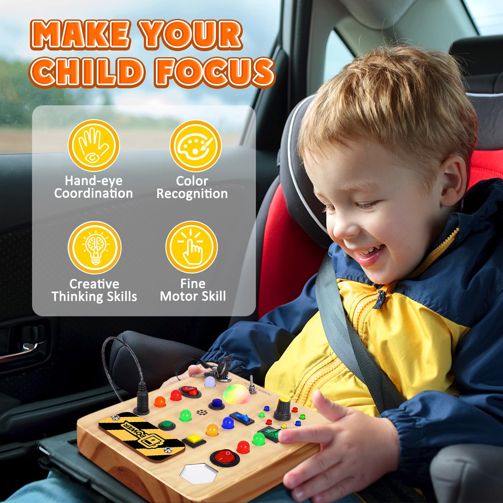 Tintecusa Busy Board With Led Light, Wooden Sensory Toys For Toddler, Montessori Music Toy For Airplane, Travel Activity Educati