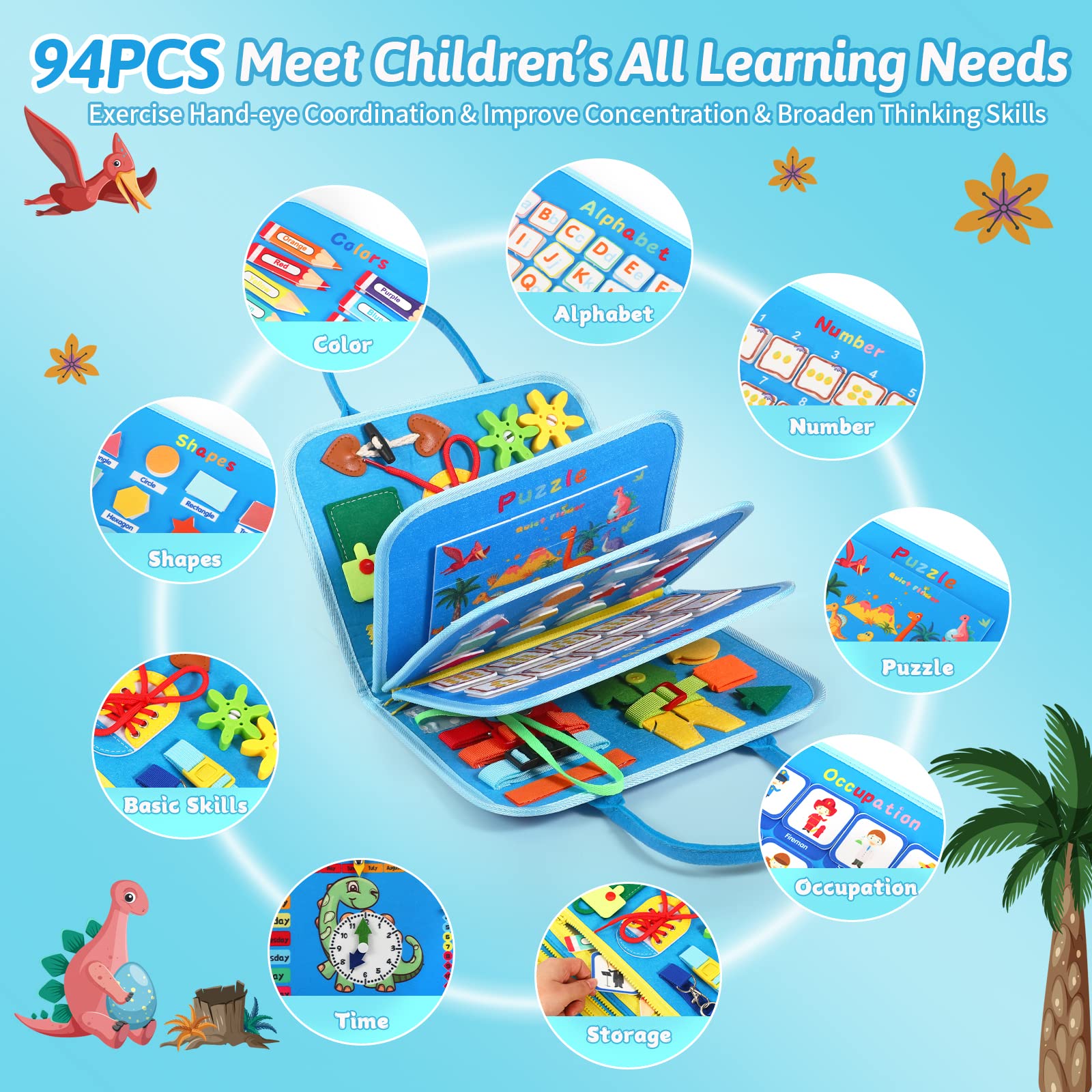 - Q: How is the busy board structured for learning? A: The board features 8 major skill learning areas with 89 learning accessories, allowing for systematic teaching of basic life skills through play, making learning fun and interactive.