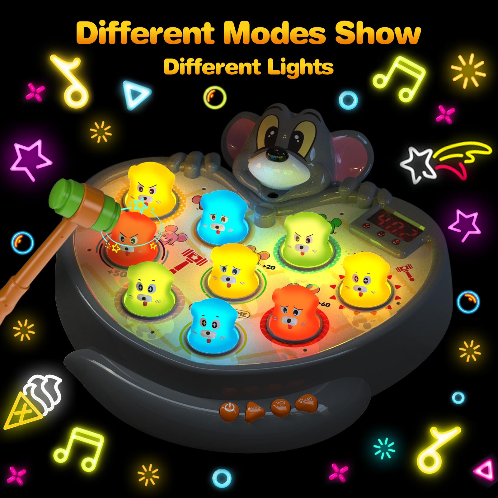- Q: What features does the Mole-Tapping Toy offer? A: This toy includes five different game modes, light-up features, nine delightful children's tunes, and a mist function, providing a versatile and interactive play experience.