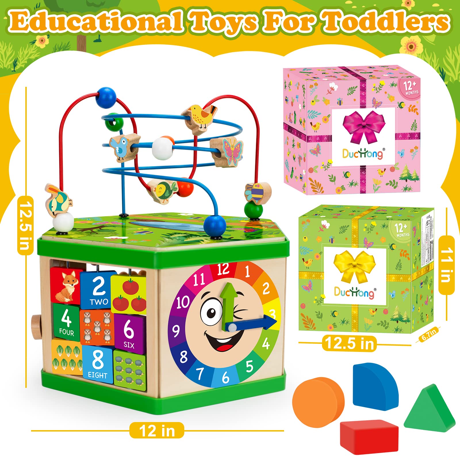 - Q: What activities does the Wooden Activity Cube include? A: The Wooden Activity Cube features 7 different activities: a wooden bead maze, abacus, spinning gears, learning clock, shape sorter, flip board, and bird slider, providing a variety of engaging options for toddlers.