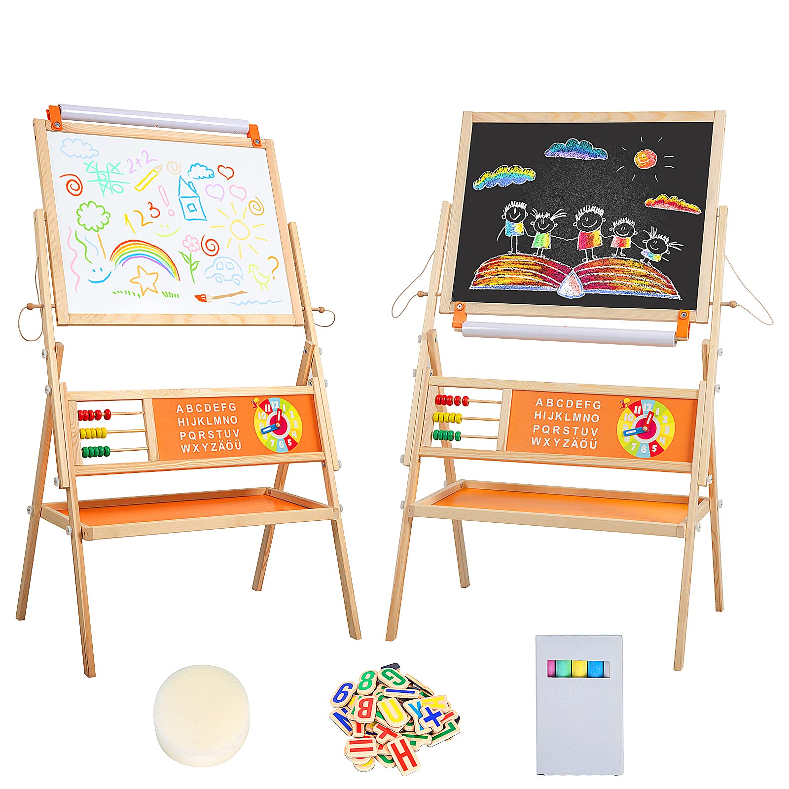 Omotiya 3-In-1 Wooden Easel For Kids, Toddle Double-Sided Easel With Magnetic Whiteboard And Painting Blackboard, 360° Rotatable, Paper-Roll Holder, Storage Tray, And Stickers Included