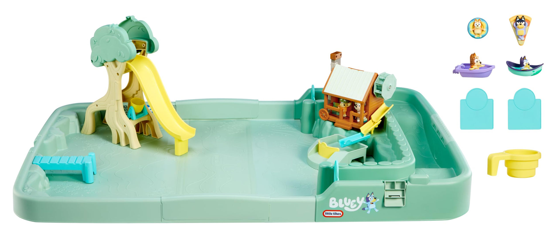 Your child will have a blast splashing around with Bluey & friends on this bushland adventure! With its open layout and interactive components, this play set is perfect for hours of outdoor playtime with multiple kids. The Bluey-themed accessories encourage imaginative play, and the splashing water pool creates a fun sensory experience for children. Kids can send Bluey down the log ride tower, play with the spinning water gears and waterfall on the Wilderness Hut, or just splash around with the water pool. When playtime is over, the water table folds easily for compact storage.