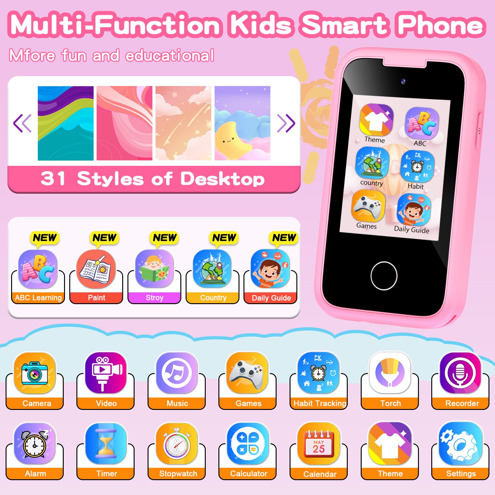 Kids smart phone with selfie-cam, MP3 player, 13 funny puzzle games ,paint,voice recorder, country,daily guide, alarm,flashlight, stopwatch, calculator, theme, screensaver select, time format, volume,26 alphabet learning,10 fables stories,10 wallpapers,31 styles of desktopetc. Which can bring convenience, fun and unprecedented new experience to children's lives. It is a perfect gift for 4-12 year old boys and girls. Upgrade Kids phone include daily guide,the habit recorder can remind children to get up, study, eat, do activities, etc., so that children can develop habits, improve self-discipline and focus,. The camera has 28 cartoon stickers so kids can take fun photos and share them with family and friends. The good life can be recorded with a camera while traveling. As the newest upgrade kids smart phone, with games to choose from kids. These games are more playable and suitable for children of multiple ages. That can effectively exercise kids logical thinking ability, reaction ability and hand-eye coordination. It is a perfect gift for 3 4 5 6 7 8 9 10 year old boys and girls.