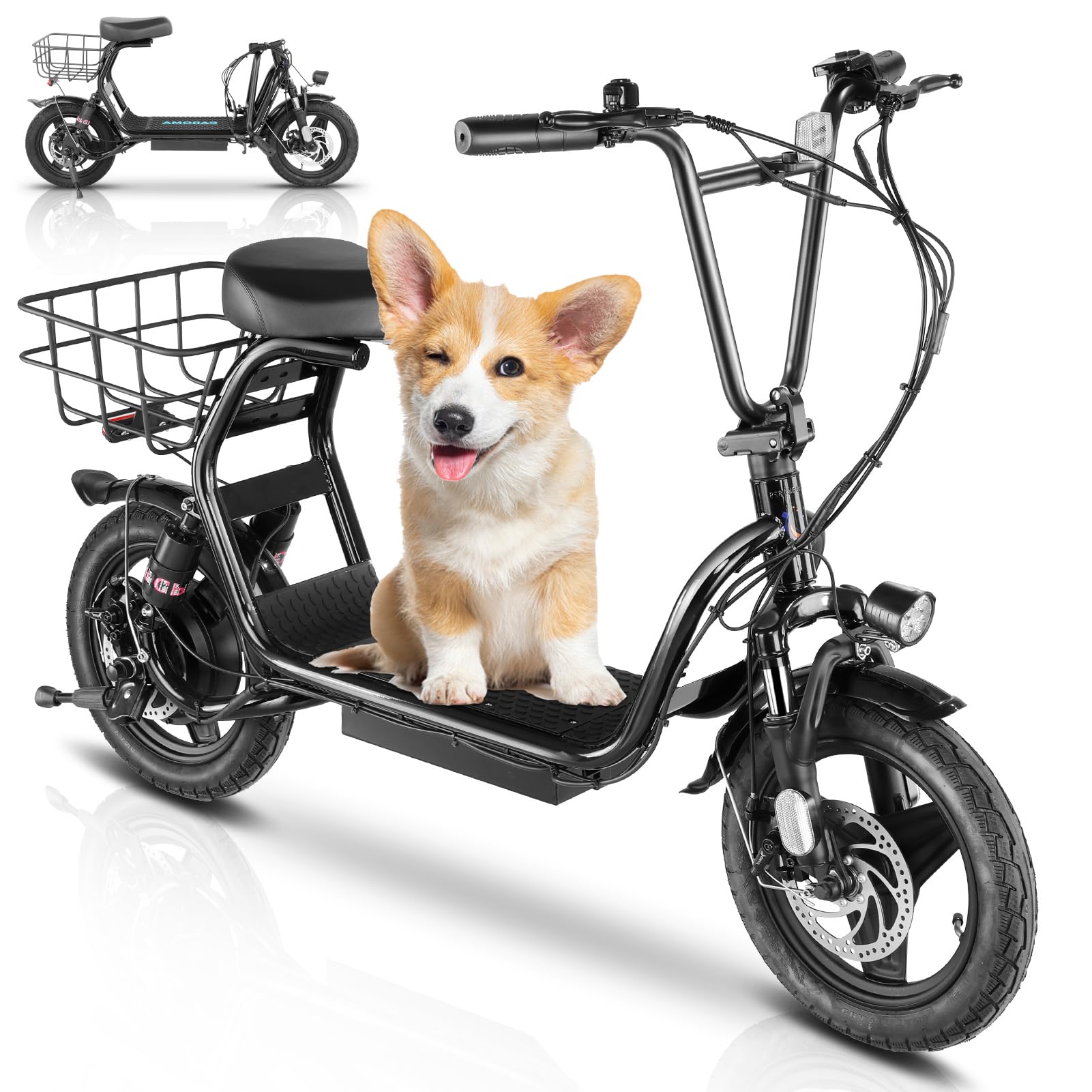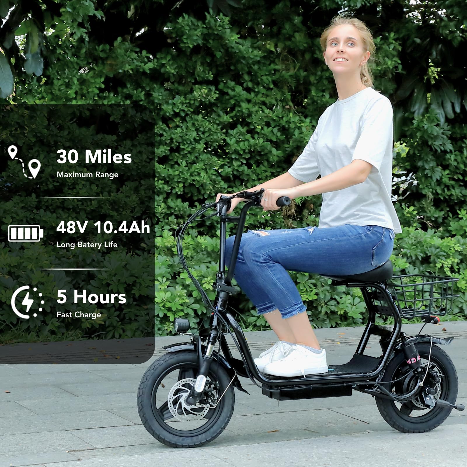 ?1200W Electric Scooter & 48V 10Ah Battery?Caroma adult electric scooter comes with a 750W powerful motor(peak to 1200W) that delivers max speeds of up to 20 mph and a 20% hill grade climbing ability. The large capacity 48V lithium battery with regenerative braking gives you a range of up to 30 miles, which is ideal for anyone who wants to commute short distance for school or office and give the adults an active lifestyle. | ?Multiple Suspension and 14'' Fat Tires?The e scooter comes with multiple shock absorptions (front, rear suspension, and seat shock) that significantly reduce shock, making your ride more comfortable and stable. The 14'' large pneumatic tires have excellent grip, high elasticity, and wear resistance. Meanwhile, this adult scooter comes with a large, soft seat and an extra-wide non-slip deck to make long rides a breeze. | ?Foldable & Safe Electric Scooter Adults?This motorized scooter has folding design for increased portability and safety features like responsive and effective dual drum braking systems, bell, headlight and red tail-light, making it a portable electric scooter for commuting. It also has durable one-piece wheel hubs and a high-strength steel frame with a good weight capacity. The compact folded size makes it easy to store in car trunks and other tight spaces. (NOTE: Max load 300lbs) | ?Smart Electric Scooter with Seat? The Caroma P5 is an electric commuter scooter designed for adults. It has a basket above the rear wheels and can carry up to 30 pounds, making it ideal for quick errands and shopping. This electric scooter also features an LCD display that clearly shows the real-time power level of the ride. Meanwhile, the handle-mounted throttle allows you to control your riding speed easily and precisely. | ?Easy Assembly & After Sales Guarantee?The adult scooter comes mostly assembled with instructions and installation tools. We provide a 12-month warranty for the e scooter. Caroma electric scooter is UL certified. If you encounter any problems with the scooter, don't hesitate to contact us and we will offer you 100% satisfactory after-sales service.