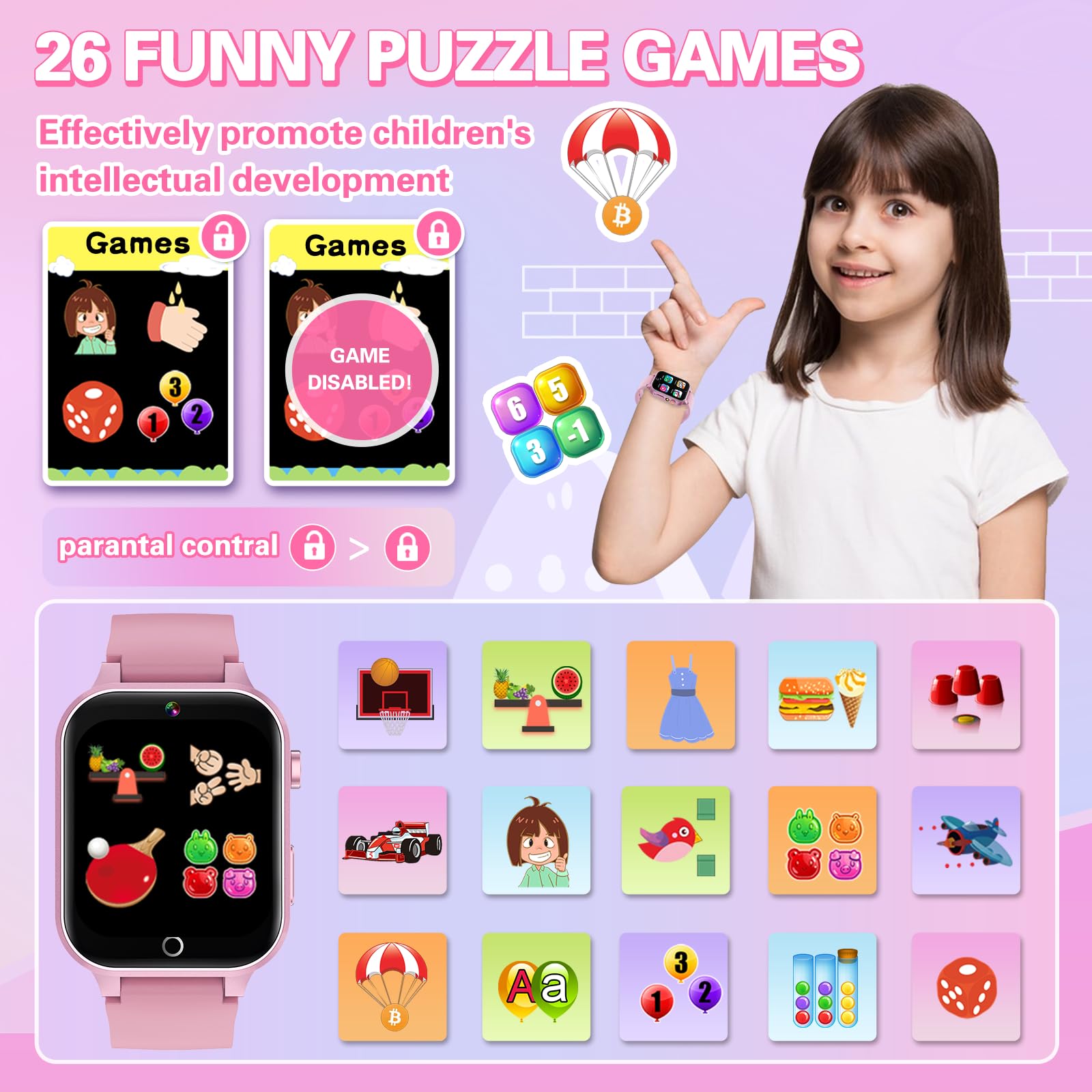 Vakzovy Kids Smart Watch for Girls 6-12, Pink HD Touchscreen, 26 Games, Video Camera, Music, Pedometer - Educational Birthday Gift