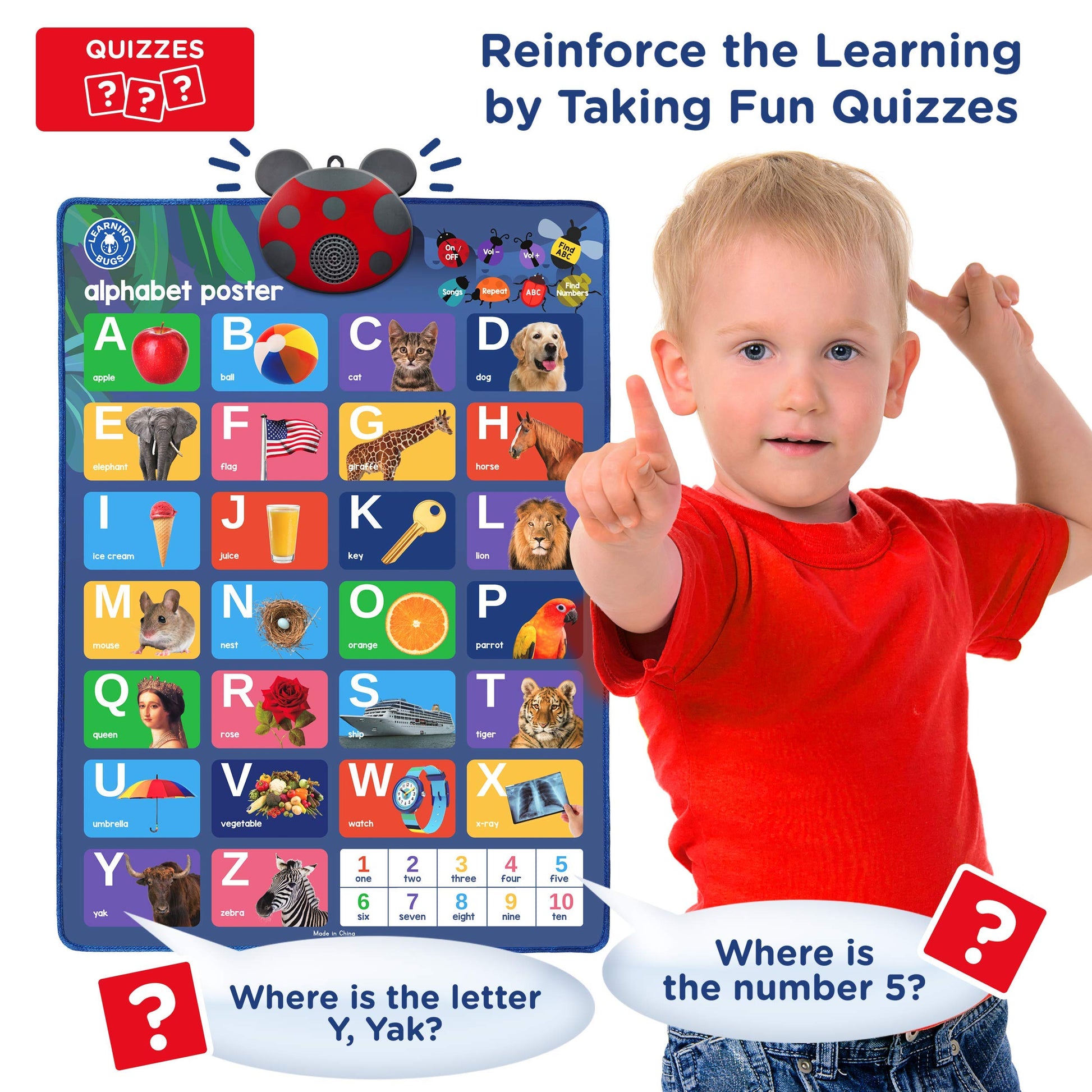 - Q: What educational benefits does the LEARNING BUGS Interactive ABC & 123s Talking Poster offer? A: The LEARNING BUGS Interactive Talking Poster is designed to stimulate early childhood development by helping toddlers and preschoolers recognize the alphabet and numbers. It features four educational modes, including alphabet recognition, number learning, singing, and quizzes, making it an ideal resource for early education.
