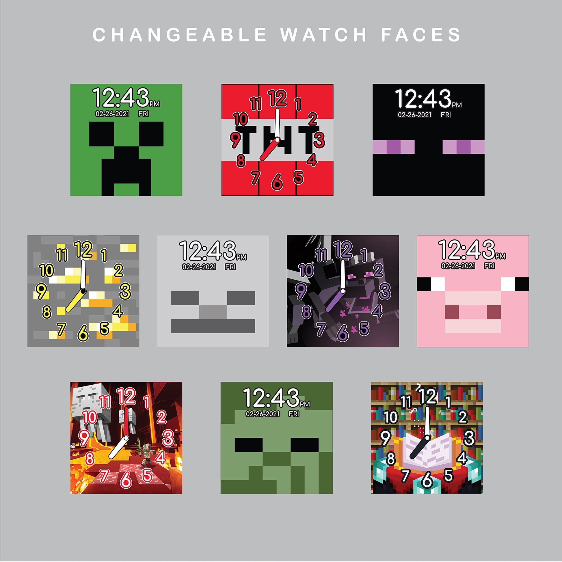- Q: What features does the Minecraft Kids Smart Watch offer? A: The Minecraft Kids Smart Watch is equipped with a variety of features including a selfie camera, photo album viewer, video player, voice recorder, calculator, alarm clock, pedometer step counter, numerous playable games, and customizable watch faces, making it an engaging device for kids.