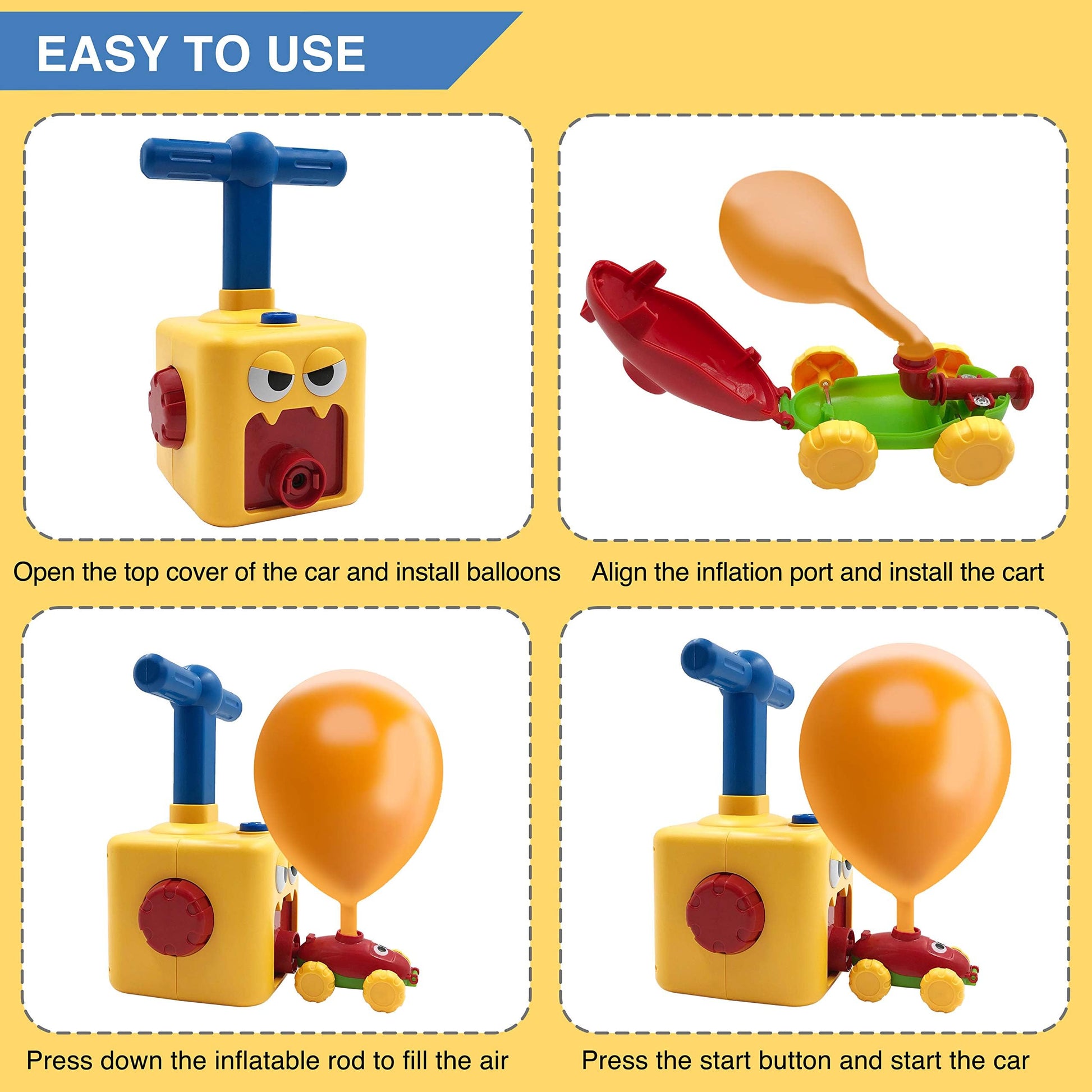 - Q: How does the Balloon Launcher work? A: The Balloon Launcher operates using a simple three-step process: fix the balloon onto the car, inflate the balloon using the provided pump, and press the release button to launch the car forward.