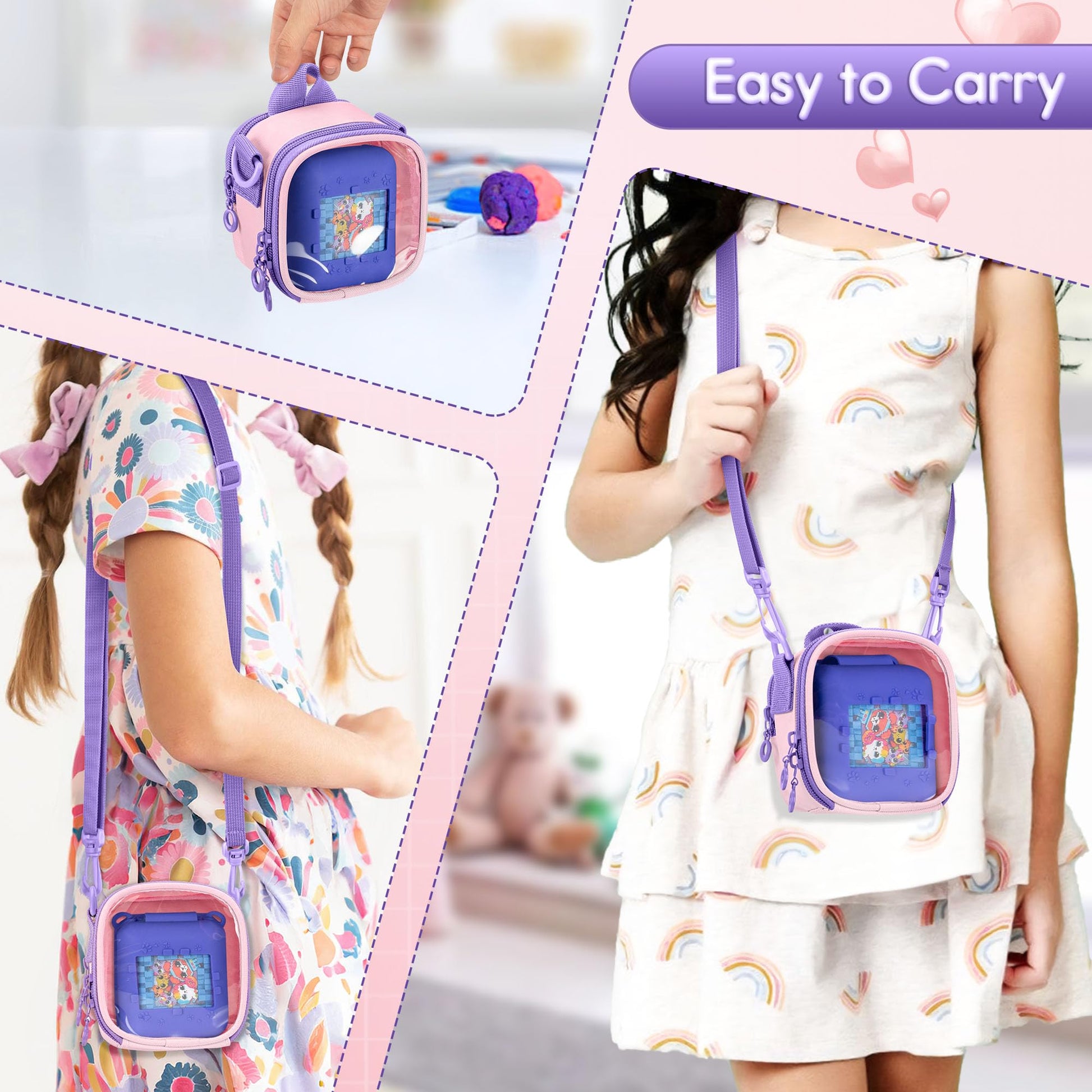 Case Only: Digital pet and accessories are not included; The main compartment compatible with bitzee* magicals digital pet and has a transparent window for easy viewing; *Our product is not associated with brand mentioned | Portable: The electronic pet toy cover bag is featured with an adjustable shoulder strap, which is lightweight and convenient to carry; Also has a hanging strap to be hung on the wall | Well-Made: The digital pet storage case is made of durable nylon to protect against scratches and drops | Accessories Storage: The back zipper pocket can hold virtual pet accessories, like batteries, manuals, and cards | Good Choice: Dimension: 3.8