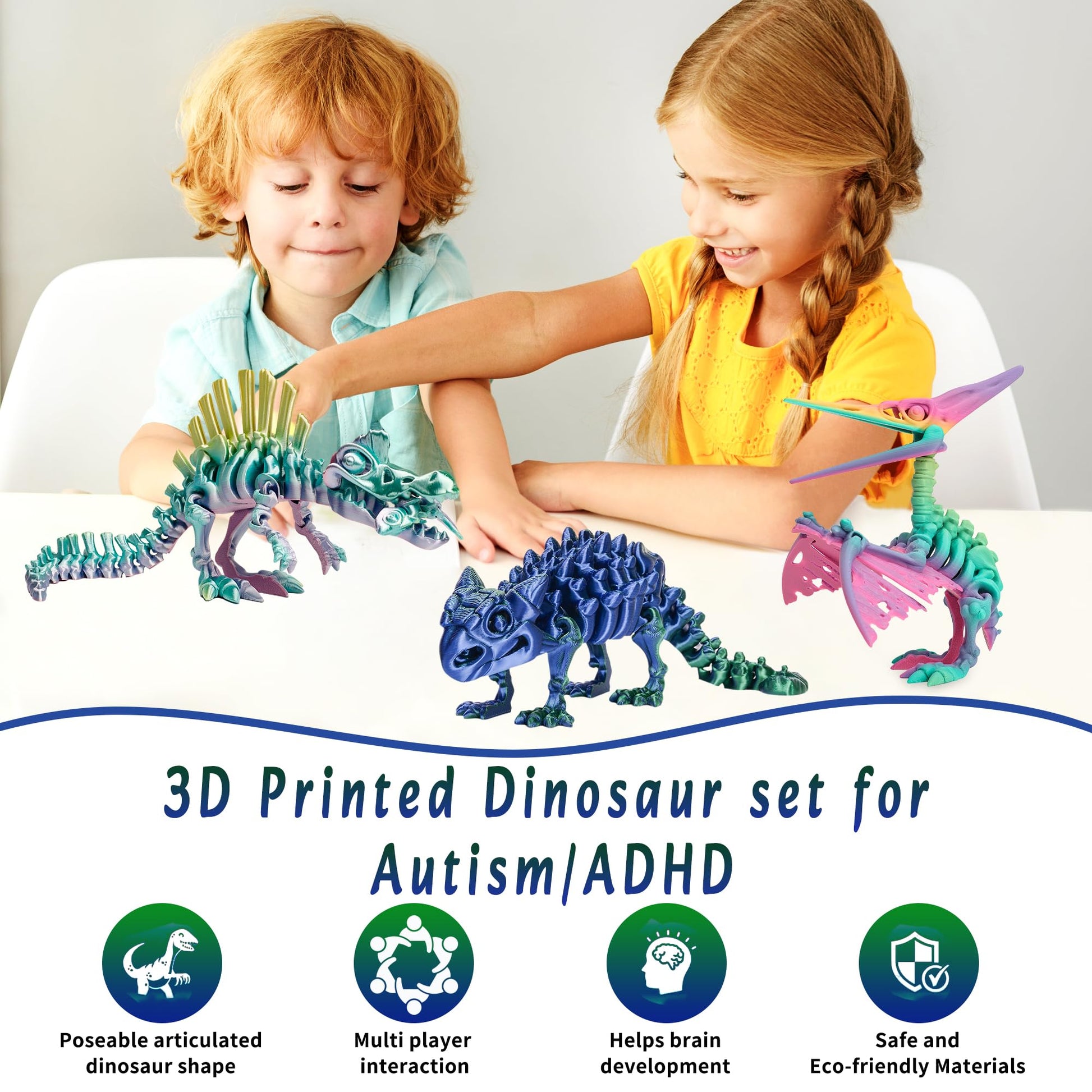 ?CREATIVE DESIGN? 3D printed dinosaurs are creatively designed with multi-angle flexibility simulated realistic motion and engaging gameplay adventures.experience the realism of prehistoric creatures with these vibrant characters. ?PERFECT DECORATION GIFT?The 3D printed dinosaur toy can decorate your room. Its detailed skeleton design makes it the perfect exhibit for a bookshelf desk or coffee table and as a cool car ornament