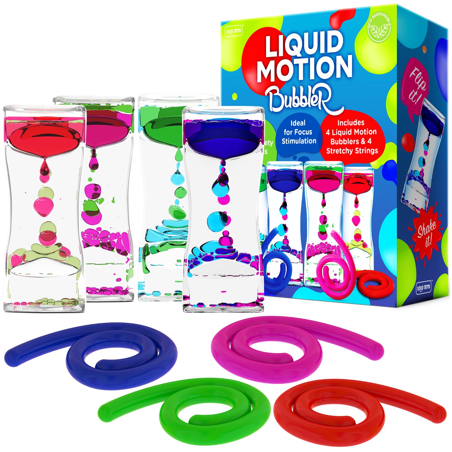 - Q: What makes this 8 Pc Set Bundle a great gift option? A: The 8 Pc Set Bundle of Liquid Motion Bubblers and Stretchy Strings makes a thoughtful gift for teachers, students, or anyone seeking stress relief. Its combination of visual and tactile stimulation, along with its ability to entertain and soothe, makes it a versatile and appreciated gift for various occasions.