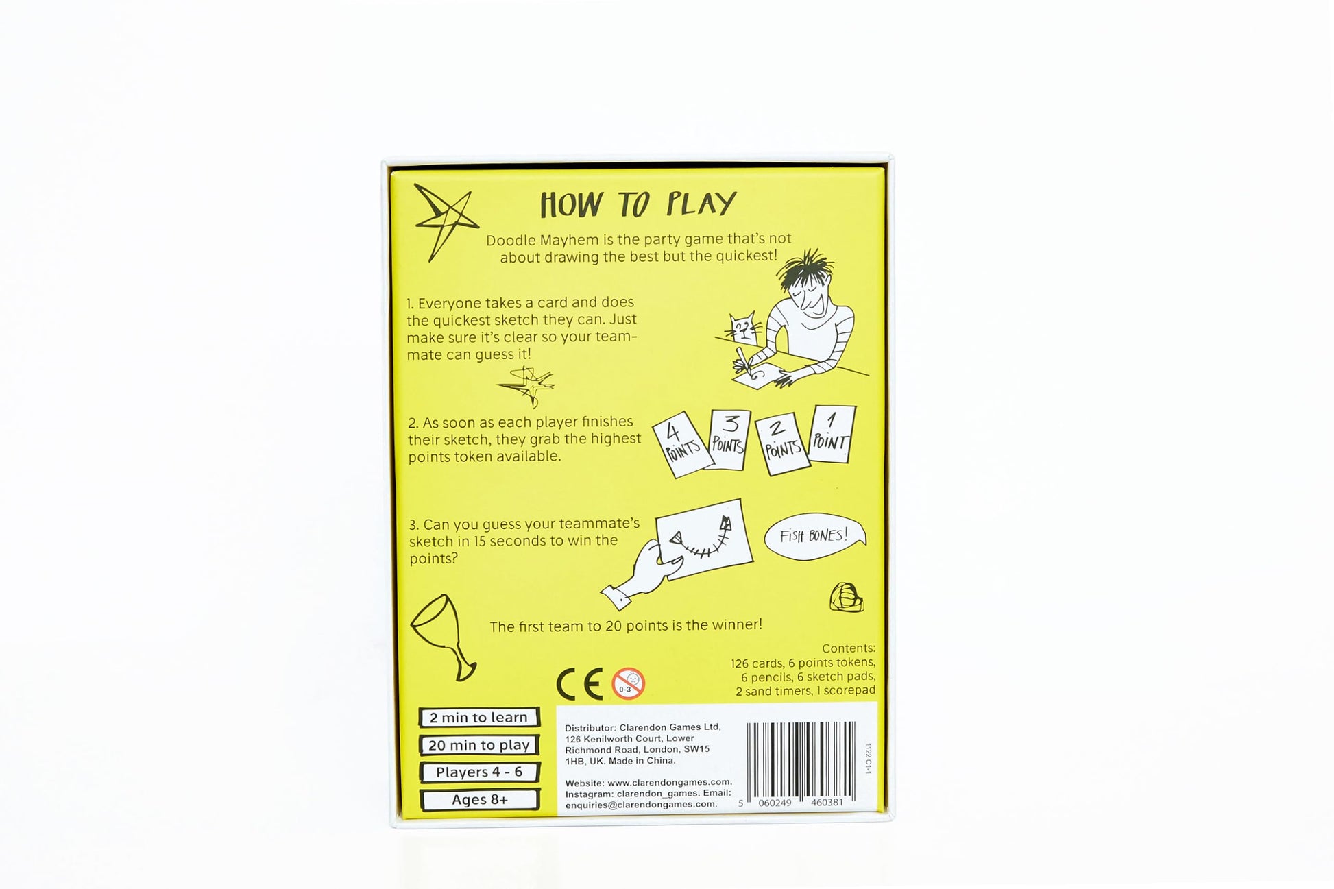 DOODLE MAYHEM is a drawing game where everyone draws at the same time! Sketch items for other players to guess. The sooner you finish your sketch, the more points you can win! Everyone takes a pencil, a drawing pad, and a handful of item cards. Lay out the points cards in the middle of the table. Someone then shouts, ready, steady, draw! and everyone sketches at the same time. The aim of the game is to draw your item as quickly as you can. However, you must draw it clearly enough that other players can guess what it is later! As soon as you have finished your sketch, grab a points card from the middle of the table. Once everyone has finished their sketch, players join their teams and take turns to guess each others sketches. The aim is to guess as many of the teams sketches before the 30 seconds is up. If your sketch is guessed, every player in your team wins the number of points on the card you grabbed. If your sketch isnt guessed, subtract the number of points on the card you grabbed from the score of every player in your team. Takes 2 minutes to learn and plays in 20 minutes. No lengthy rules manuals, no fiddly bits - just jump straight in and enjoy! For 4 to 6 players. Ages 8+, ideal for a party, after dinner, or on holiday. Ages 8+, 4-6 Players, 20 Minute Playing Time.
