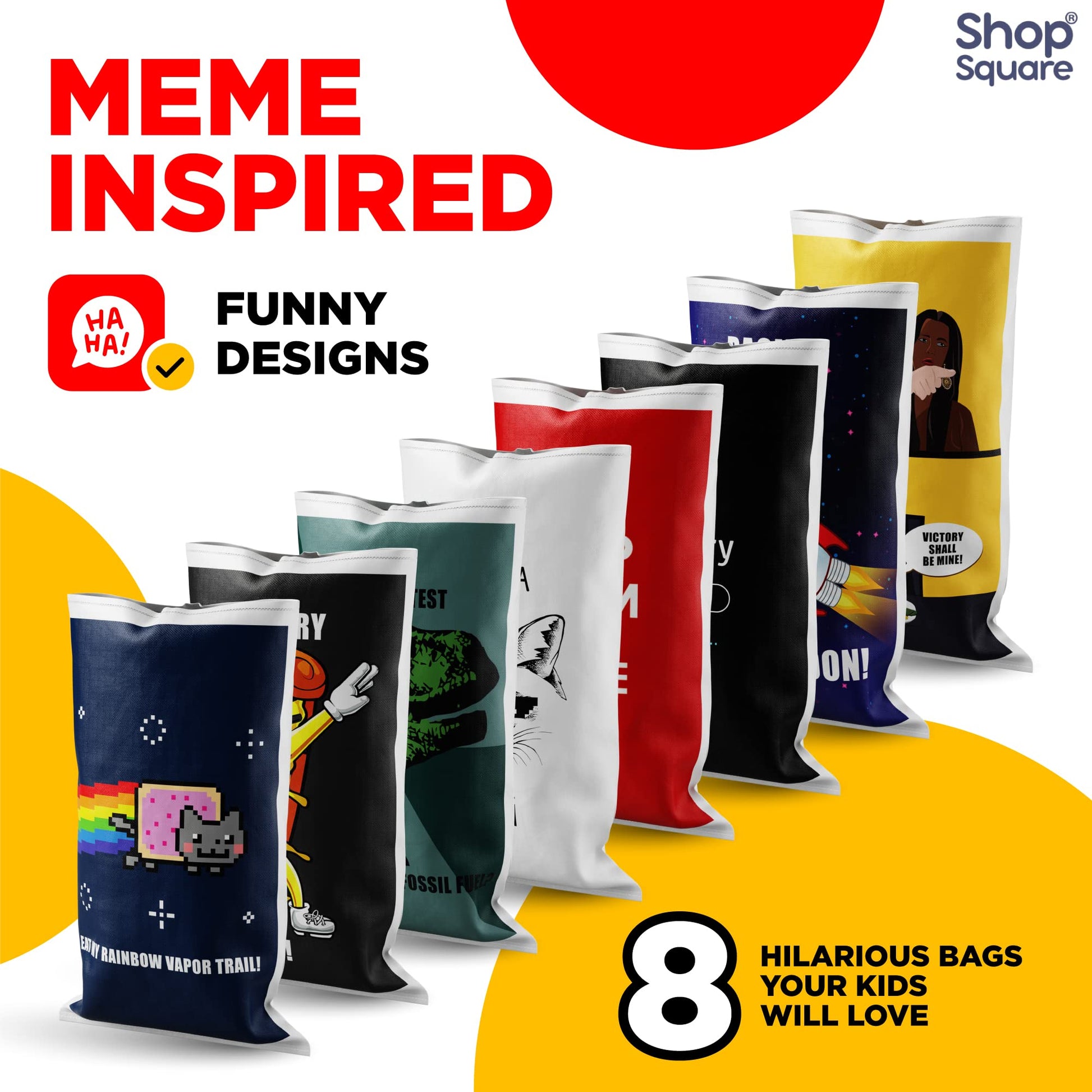 Did someone say memetastic potato sack race? Yard games will never be the same after hopping around in these funny, unique, potato sacks. Add nyan cat, a dabbing pizza, and more to your collection of kids party games. Remember, there are 8 different designs, but only one race winner! These bags are huge! At 23 x 40, they can easily fit both adults and kids. Family yard games will never be the same. A party pack of 8 unique jumping sacks means everyone can join in on the race. Adults want to have fun too! You will be using these potato sack race bags a lot, but dont worry, they are very durable and strong. Made from interwoven plastic, they wont rip or tear and can be used for many years to come. Waterproof, they wont fade and will look great for all of your outdoor adventures. You can even use them for storage when the races are over. Become the king and queen of kids party games with this hilarious set of potato sack race bags. They are perfect for birthday parties, bbqs, picnics, family reunions, or holiday parties.