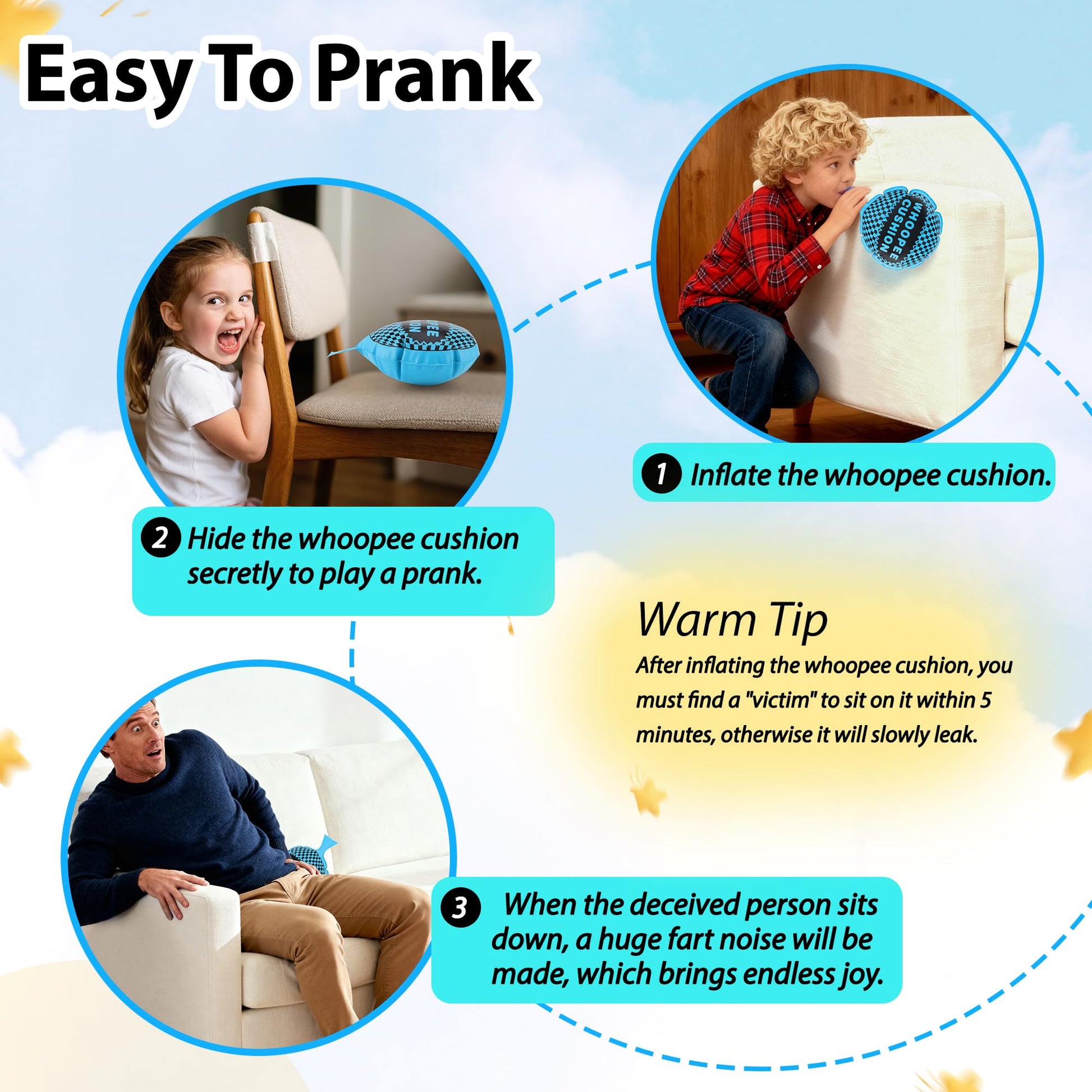?Fart Noise for Fun?Release fart noises anytime anywhere. Imitate the popping sound coming from the other end and induce endless laughter with this whoopie cushion. This whoopee cushion is expertly designed to produce the funniest most realistic fart noises making you the ultimate prankster