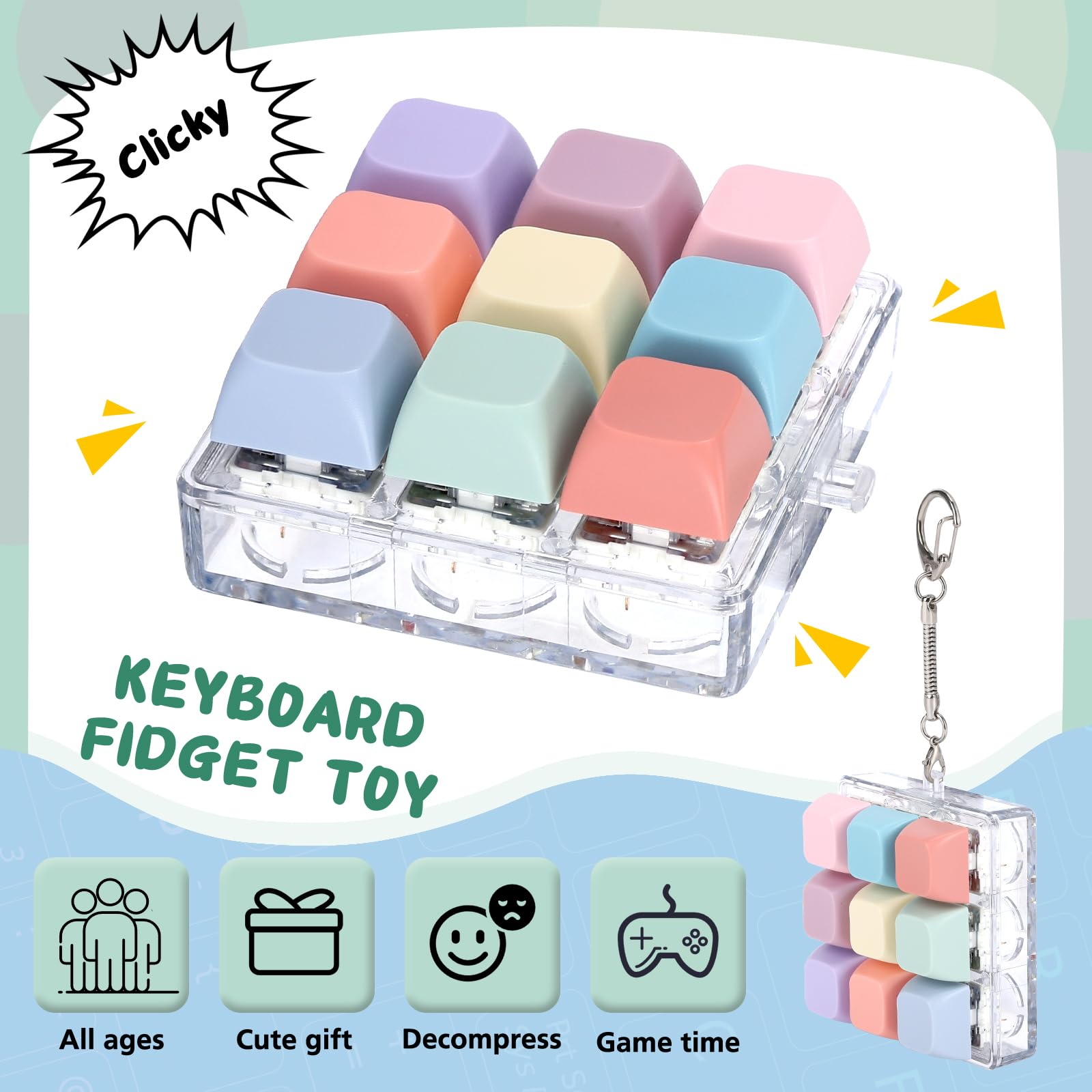The fidget keychain combines a unique keyboard-inspired design with stress-relief functionality, offering a satisfying tactile experience. Made from safe, durable materials, it's portable, versatile, and suitable for all ages. Perfect as a stress-relieving gadget, gift, or decoration, it brings joy and focus to work, study, and daily life