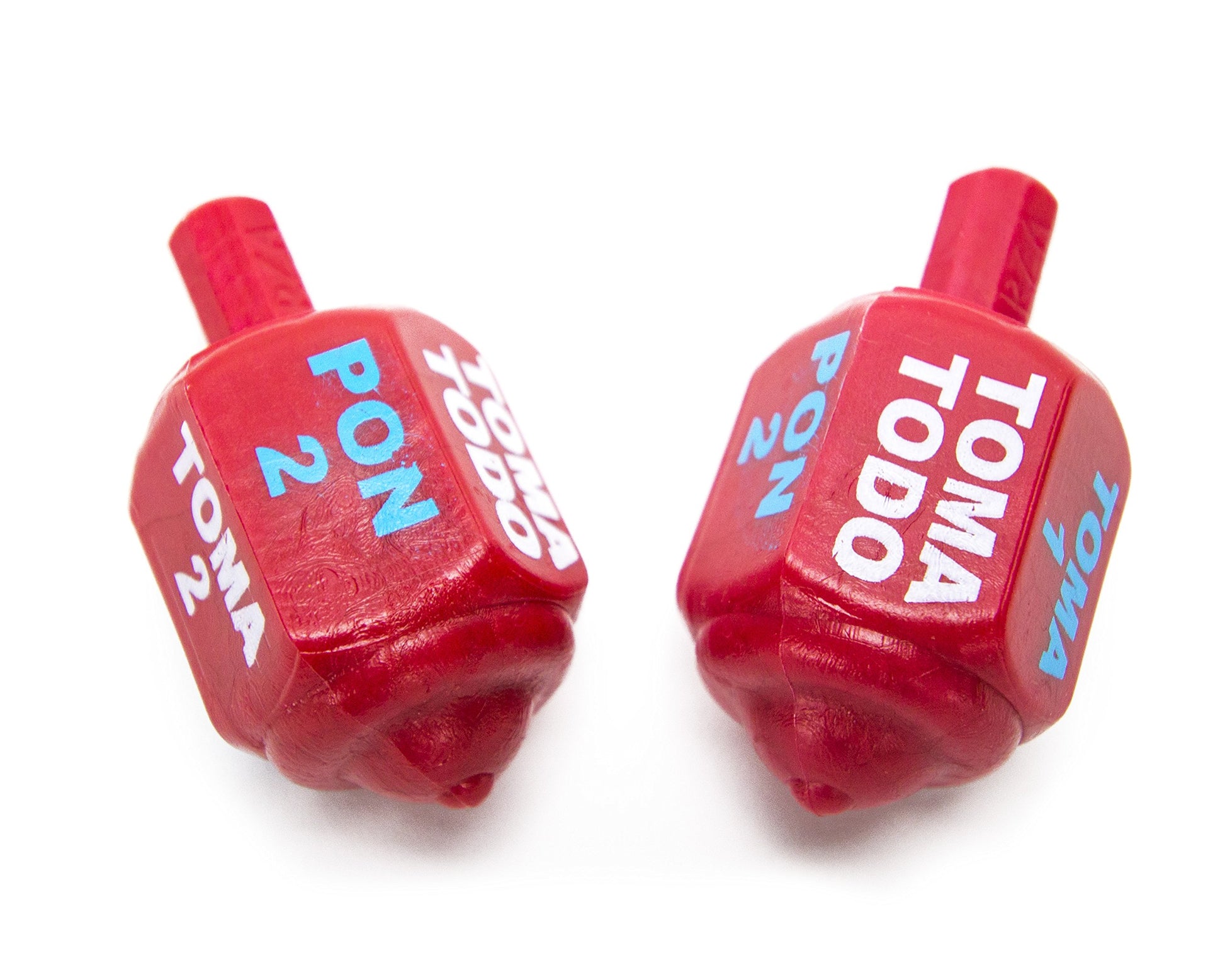 INSTRUCTIONS ON HOW TO PLAY: All the players put a nut or a coin in the middle. Then the players take turns. They hold the top of the pirinola with their fingers and spin it. Then they have to take or put down the number of nuts or coins indicated on the pirinola: Pon 1 (place 1), Pon 2 (place 2), Toma 1 (take 1), Toma 2 (take 2), Todos Ponen (everyone place 1), Toma todo (take everything). At the end of the game, the player who has the most nuts or coins wins.