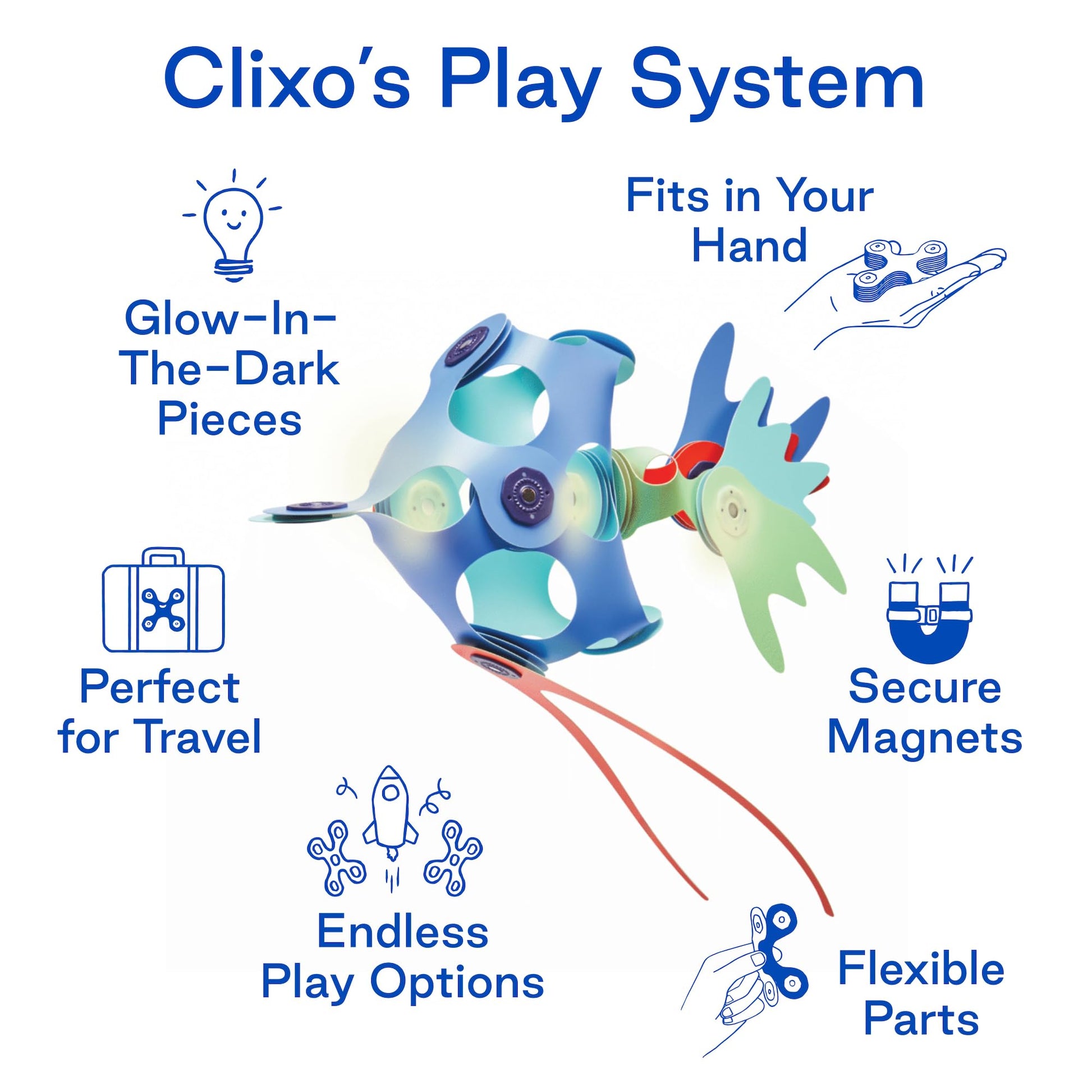 - Q: How do the glow-in-the-dark features work in this magnetic building toy? A: The glow-in-the-dark pieces of the Clixo Ocean Creatures Pack are made from a special material that absorbs light and emits a soft glow in dark conditions, enhancing the play experience by bringing marine life to life in your child's room.