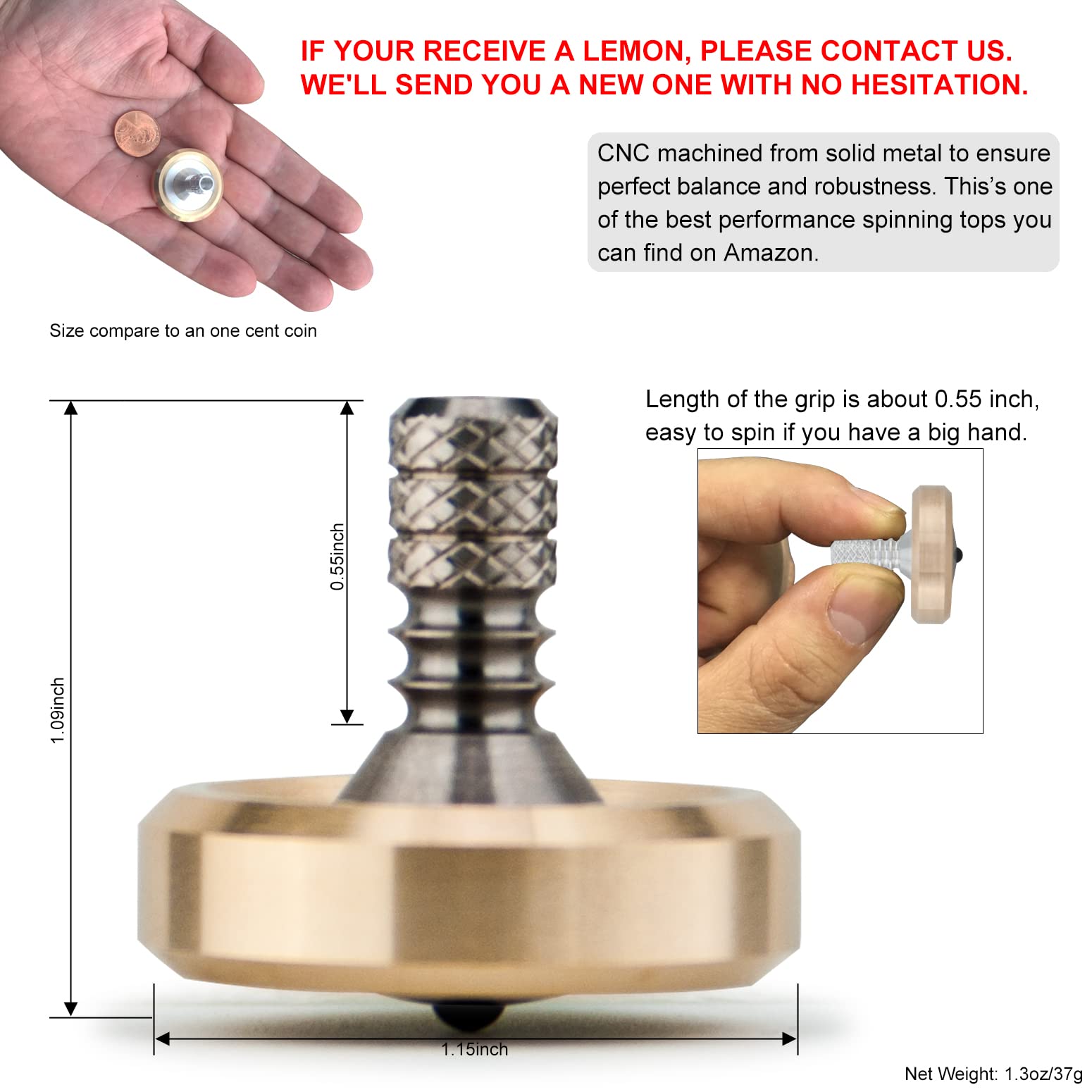 This spinning top is perfect for time killing and practicing. You can expect 5-8 minutes on a concave glass. With CNC machined body ceramic tip and perfect craftsmanship this will be one of your favorite daily toys. A perfect desktop toy to add to your collection. The speed of top rotation around its axis determines the top sloshing. The slower the rotation the bigger the wobble the worse the stability; The faster you turn no wobble and therefore the better stability. Practice repeatedly and pray your average spinning time will be longer. The top is among the worlds oldest toys. Spinning this top is both soothing and challenging at the same time. Even at rest they are individual works of art. Easy to operate long spinning time shinning appearance size weight feeling between your fingers: everything about this spinning top is perfect except for the price. All in all we hope you will think it worth the money invested when previously opened and play. Specifications: Brand: DjuiinoStar Model: DST-814R Overall Dimensions: 1.15x1.15x1.09inch/29.3x29.3x27.8mm(LxWxH) Net Weight: 1.3oz/37g Material: Titanium Brass Silicon Nitride CeramicOff-center Tolerance of The Tip: 0.02mm Packing List: Spinning Top x1 Have fun! ^???^