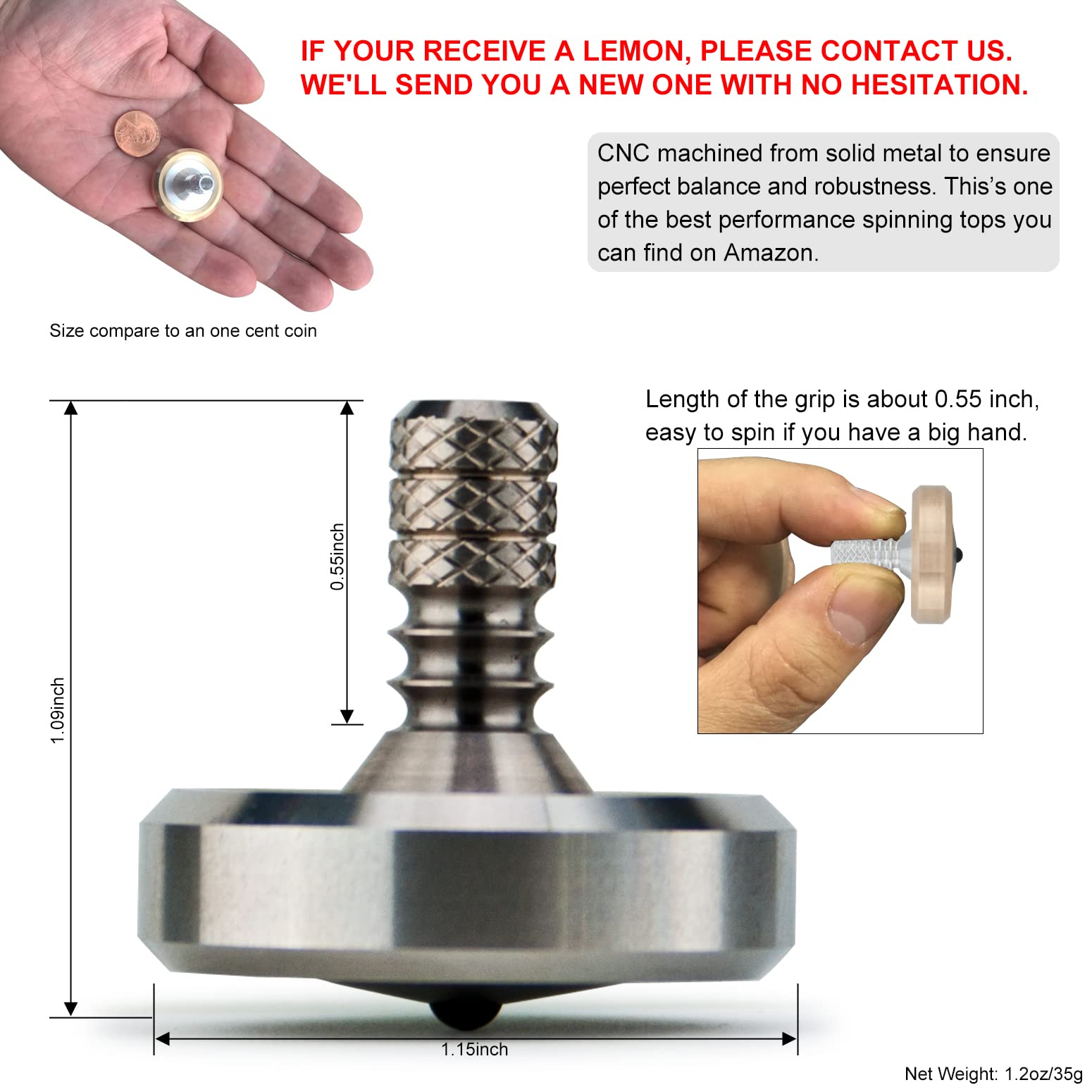 This spinning top is perfect for time killing and practicing. You can expect 5-8 minutes on a concave glass. With CNC machined body ceramic tip and perfect craftsmanship this will be one of your favorite daily toys. A perfect desktop toy to add to your collection. The speed of top rotation around its axis determines the top sloshing. The slower the rotation the bigger the wobble the worse the stability; The faster you turn no wobble and therefore the better stability. Practice repeatedly and pray your average spinning time will be longer. The top is among the worlds oldest toys. Spinning this top is both soothing and challenging at the same time. Even at rest they are individual works of art. Easy to operate long spinning time shinning appearance size weight feeling between your fingers: everything about this spinning top is perfect except for the price. All in all we hope you will think it worth the money invested when previously opened and play. Specifications: Brand: DjuiinoStar Model: DST-812R Overall Dimensions: 1.15x1.15x1.09inch/29.3x29.3x27.8mm(LxWxH) Net Weight: 1.2oz/34.5g Material: Titanium Stainless Steel Silicon Nitride CeramicOff-center Tolerance of The Tip: 0.02mm Packing List: Spinning Top x1 Have fun! ^???^