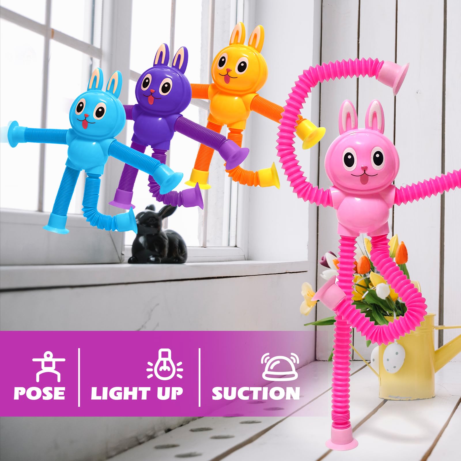 Easter Bunny Led Pop Tubes Light Up 4 Pcs Sensory Fidget Toys, Telescopic Suction Cup Easter Basket Stuffers Easter Egg Fillers