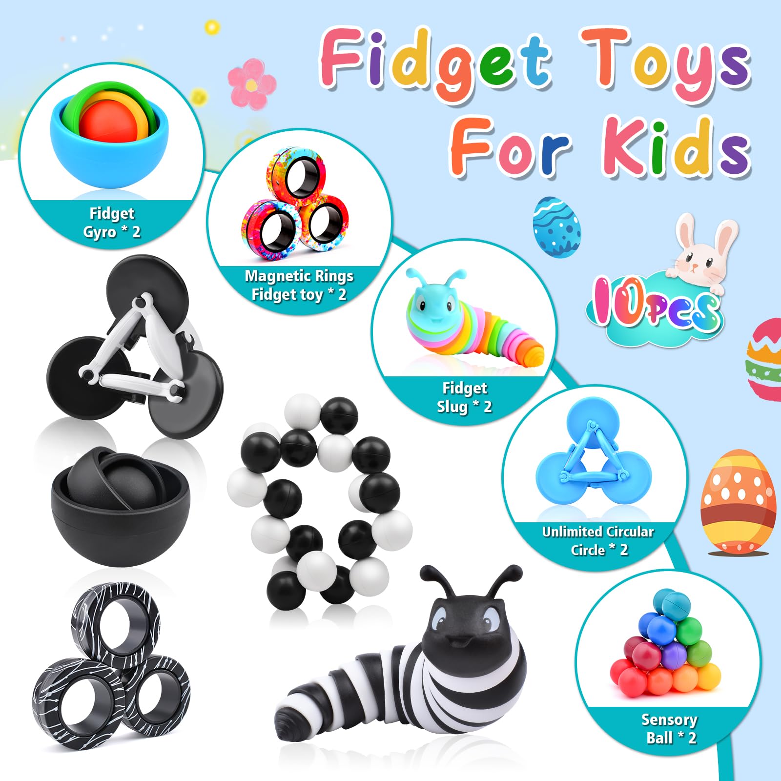 Sensory Fidgets Toys Bulk: 10PCS good-value fidget toys set includes 2 fidget gyro toy,2 fidget slug toy,6 magnetic rings fidget toys,2 circular circle and 2 sensory ball toys | Premium Quality: Our ADHD fidget toys are made of durable plastic materials, smooth surface without rough edges, rest assured to play, help your kids improve concentration when studying. | Relieve Stress and Anxiety: Our fidget toys kit can effectively relieve stress; Have fun for hours while practicing and improving finger flexibility; Keep your hands and minds busy during work. Great office desk fidgets for adults kids | Portable Fidget Toy: Each fidget toy is easy to operate, which can be used anywhere, anytime in various locations and occasions such as home, office, school, restaurant, theater, public transportation, etc. Make your daily life funny | Perfect Gift for Kids: This fidget spinner is a great birthday party gift, Easter basket stuffers, Christmas stocking stuffers, class reward, carnival prize, thanksgiving gift, Halloween gift, Easter gift, gift bag filler. It is also the best gift for ADD, ADHD, Autism, ASD