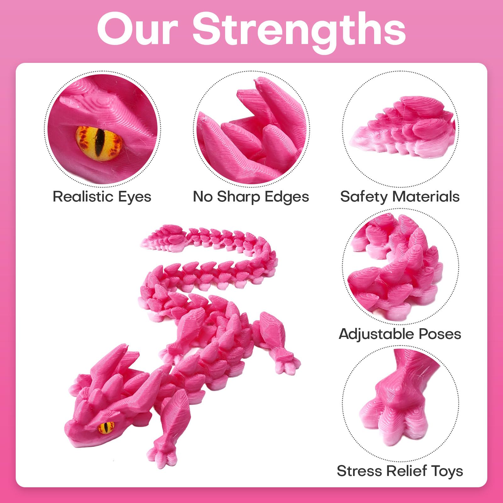 Our durable eco-friendly PLA plastic dragons are lightweight yet strong with adjustable poses. Safe non-sharp design perfect as desk toys or decor. Great for ADHD Autism and relaxation. Vibrant whimsical and quality-checked. Replacement available if damaged.