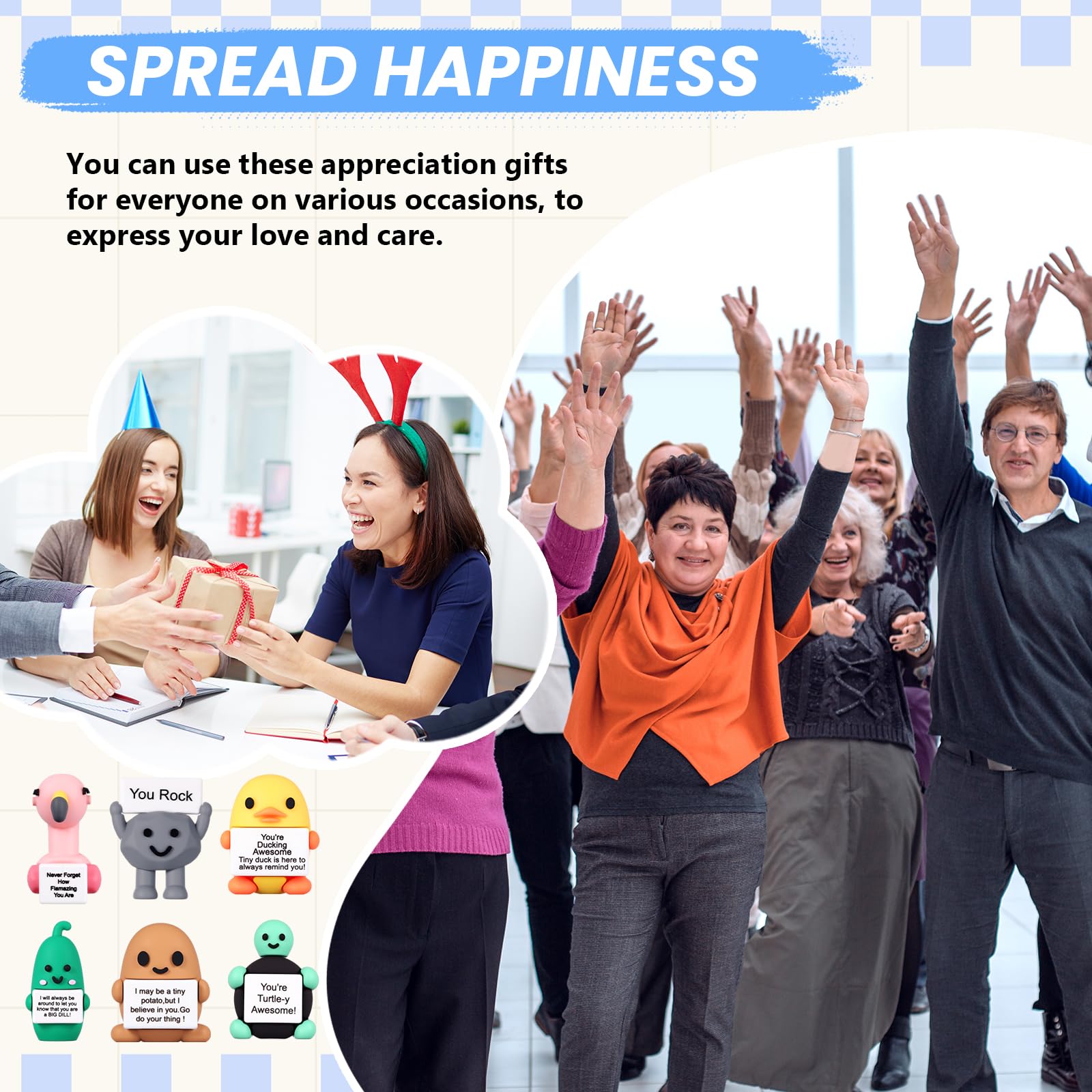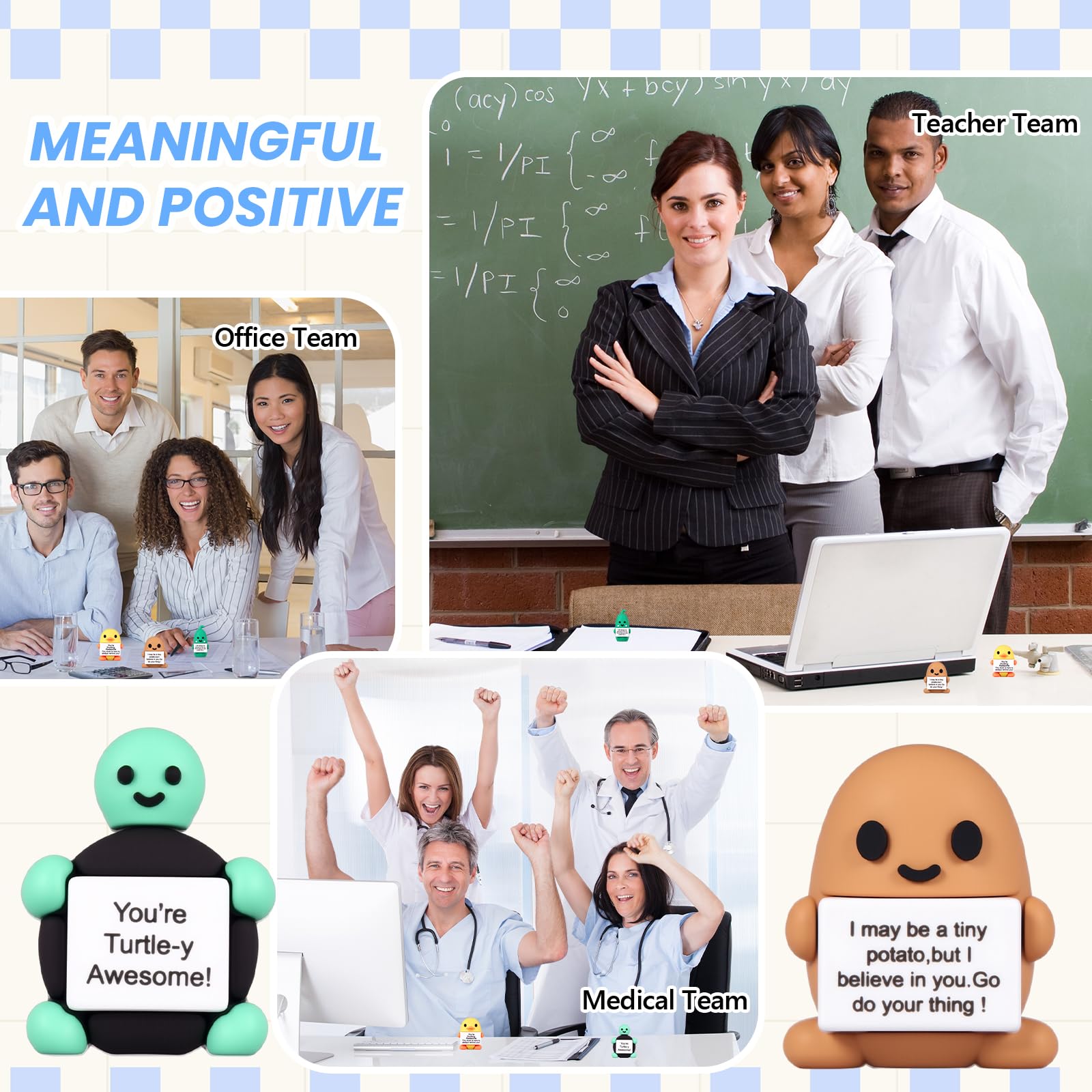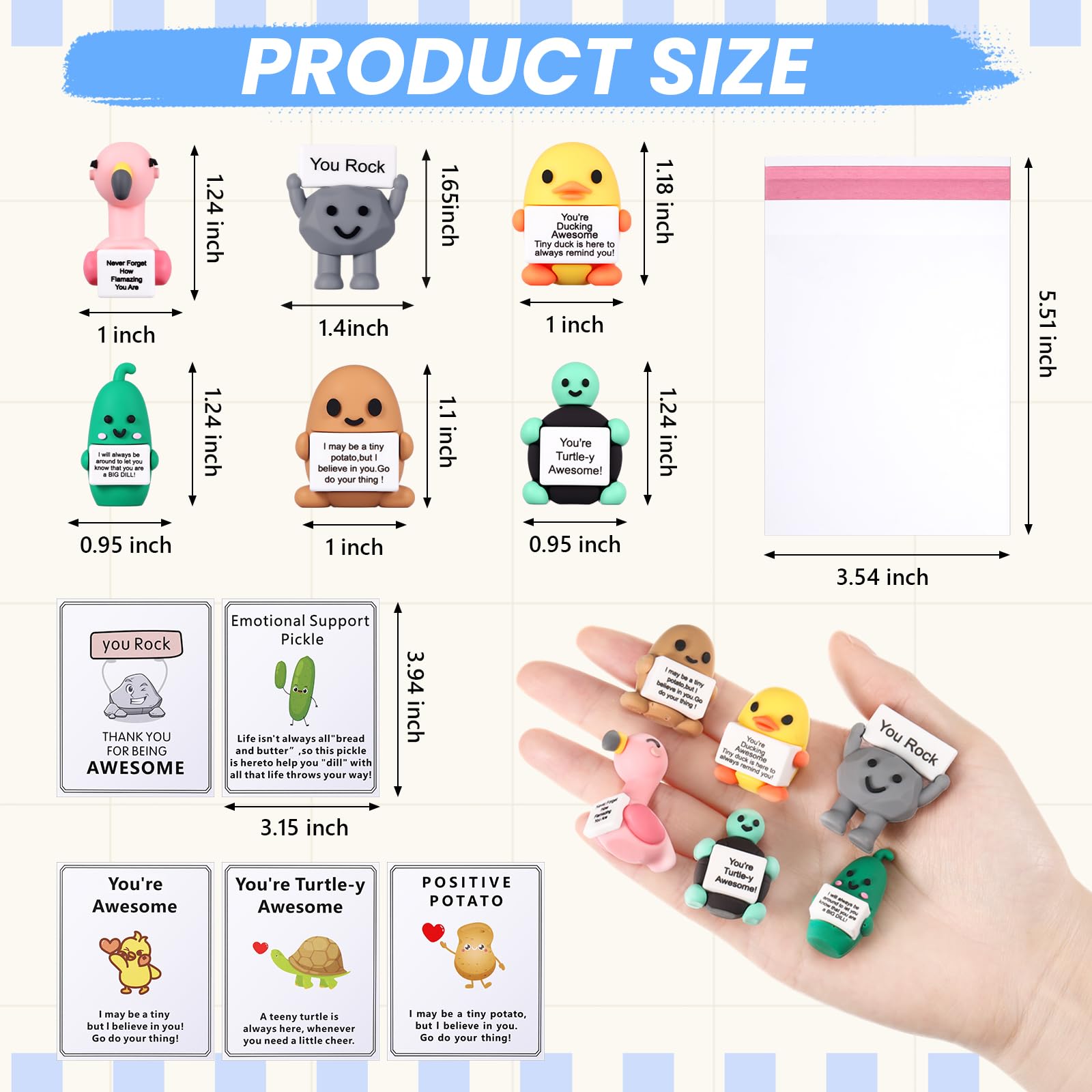 Features: Creative and inspiring design: Our encouraging gifts feature a cute figure holding a slogan board as the main design with a smiling face bringing people a good mood. The slogan board is printed with inspiring words to encourage bringing people energy and motivation Motivational gifts: These inspirational dolls and warm words will offer them support and comfort. Whenever we encounter setbacks and depression we can take a look at these lovely dolls to inspire more strength and get through the hard times Specifications: Material: rubber Color: multicolor Size: about about 1.57 inches /4 cm in size Package includes: 48 x Mini positive dolls(including 8 for each type of potato stone turtle pickle duck and flamingo) 48 x Cards 50 x Rubber dots 50 x Packaging bags Notes: Manual measurement please allow slight errors on size. The color may exist a slight difference due to different screen displays.
