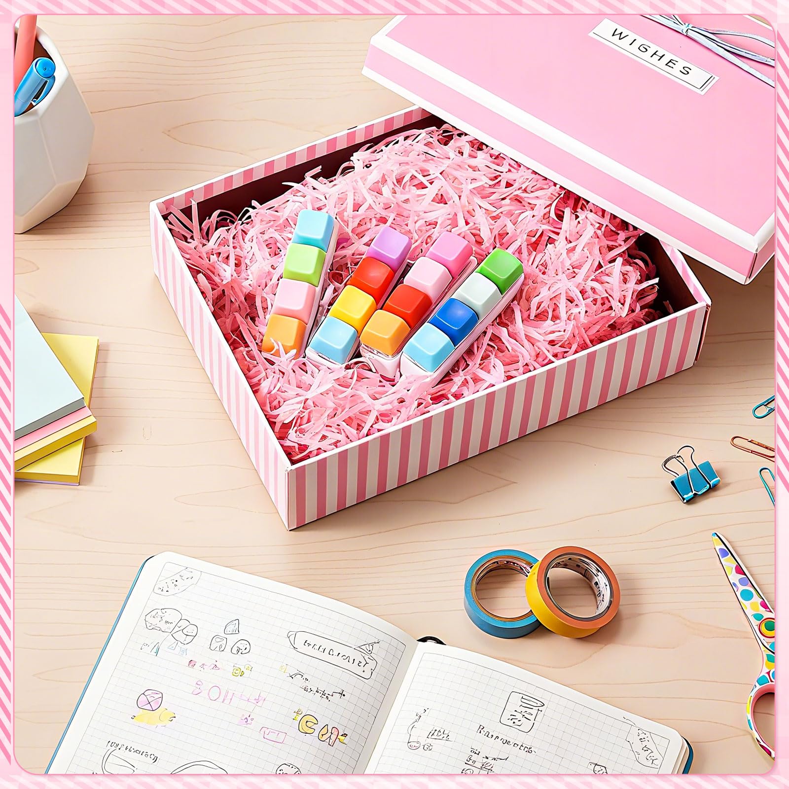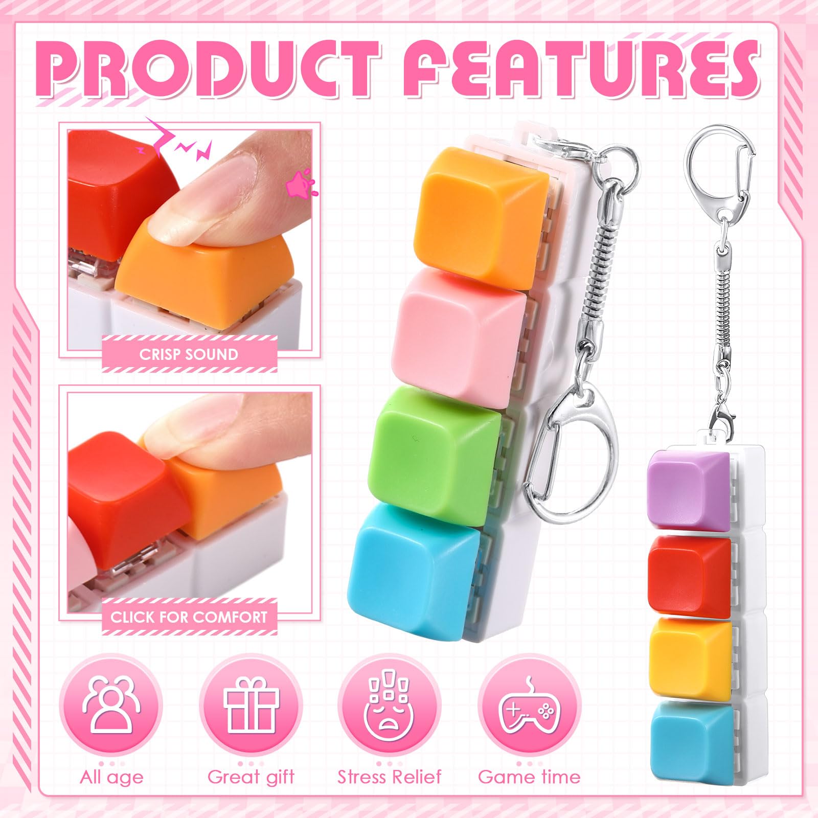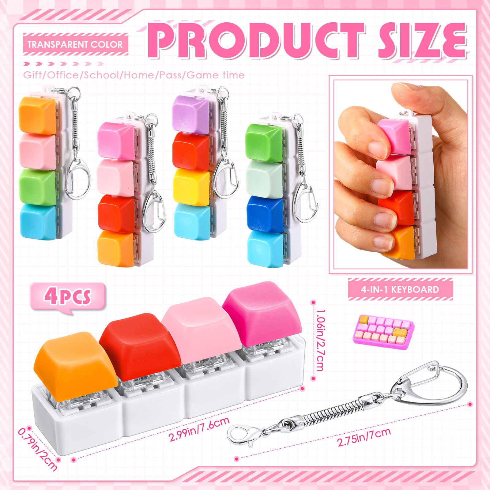 Features: Get 4 pcs Keyboard Fidget Keychain. Multiple keychains can be shared with family and friends. Mix and match them in various colors as you like to show your unique fashion charm. The sound and bounce of the keyboard mature-themed fidget toy can help you relieve stress and is mini for easy carrying to many places like office school travel Specifications: Material: Keycap: ABS material Bottom: PC material Color: Keycaps: mix colors Bottom: white Size: Keyboard about 7.6 x 2 x 2.7cm / 2.99 x 0.79 x 1.06 inches. Chain about 2.75 inches / 7cm Weight: 26g Package includes: 4 x Keyboard Fidget Keychain Notes: Manual measurement please allow slight errors on size. The color may exist a slight difference due to different screen displays