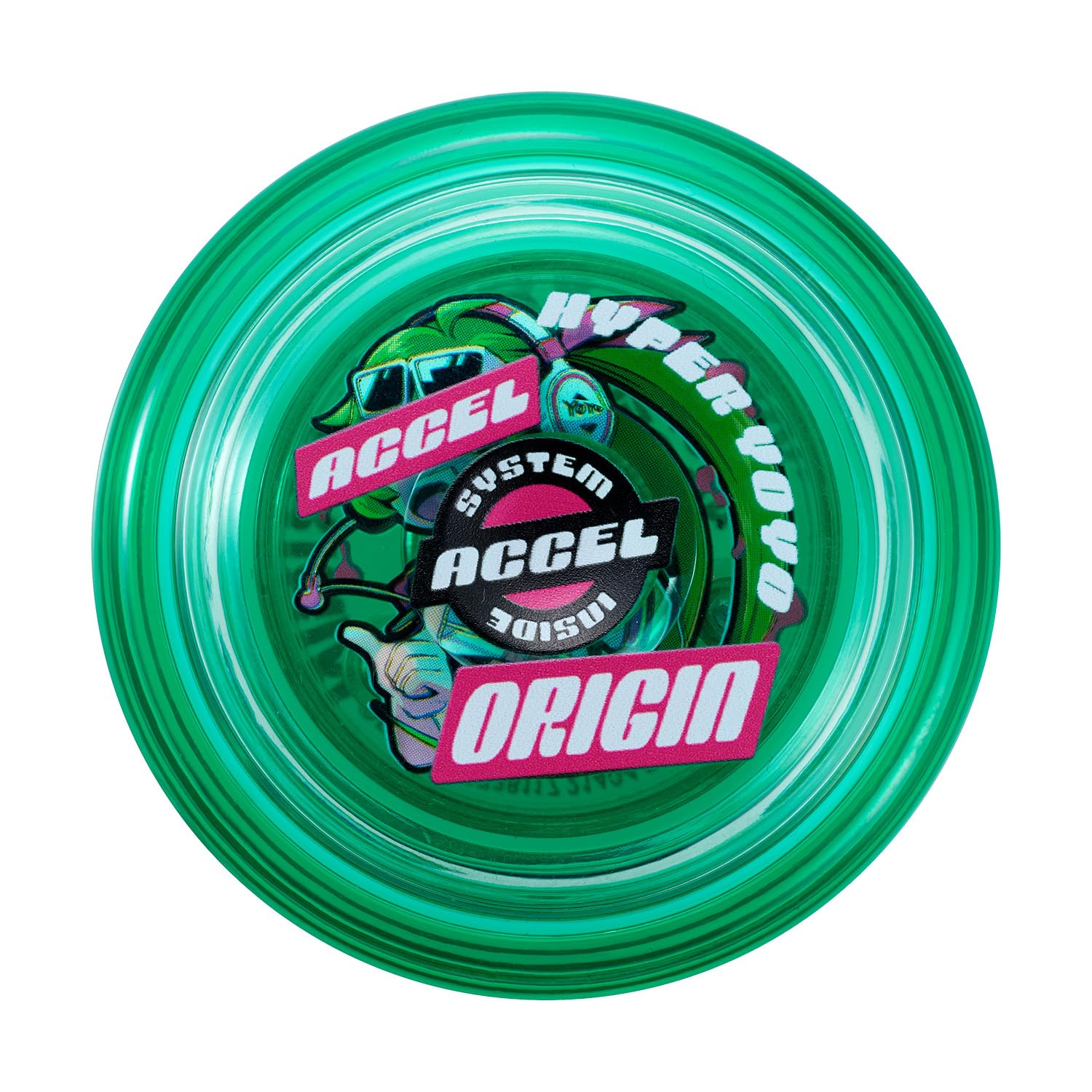Hyper Yoyo Accel, which is incredibly popular in Japan right now, is finally coming to the US! The Hyper Yoyo Accel series features the innovative ''Accel System,'' a patented technology (pending in both Japan and the US) that allows the yoyo to spin at high speed without being thrown. By pulling the string sharply while holding the yoyo, the system enables new tricks that were impossible with traditional yoyos. The ''Accel Origin'' is an entry-level model designed specifically for beginners. It excels in making basic tricks like ''Accel Spin,'' ''Trapeze,'' and ''Walk the Dog'' easy and enjoyable to learn. The ''Accel Origin - Punkish Green'' is a yoyo with a clear green body featuring a design inspired by punk rock.