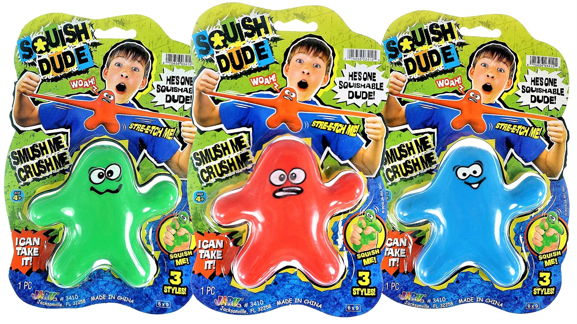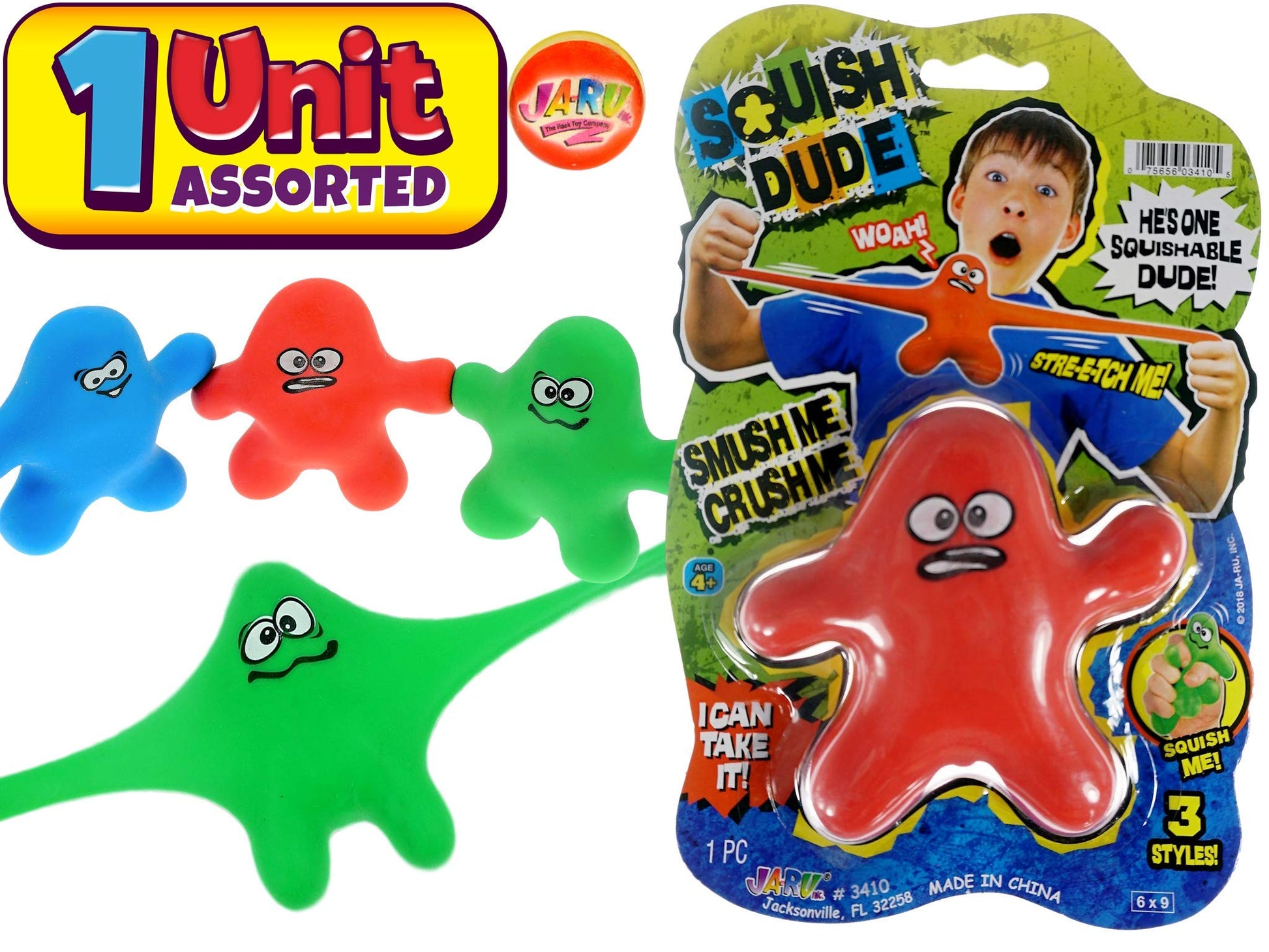 JA-RU's Squish Dude are amazing happy toys that are very stretchy and incredibly fun so you can pull them and twist them all you want and then let them go back to normal! Pull on an arm and have a friend pull a leg and enjoy hours of stretchy squeezy fun perfect Filer for Easter baskets this season. The fidget toy is also great for kids and mature-themeds with sensory issues as it will help them focus and calm down. It is perfect for the classroom the office for students parents therapists and everyone else! This fidget toy is made with the customer-favored materials and with special care so you can rest assured that it is safe for your kids. The gel stretchy toy is made with elastic and durable material that is BPA and phthalate-free for maximum performance and safety. Comes in any assorted style and color: Silly Green Angry Red and Happy Blue.