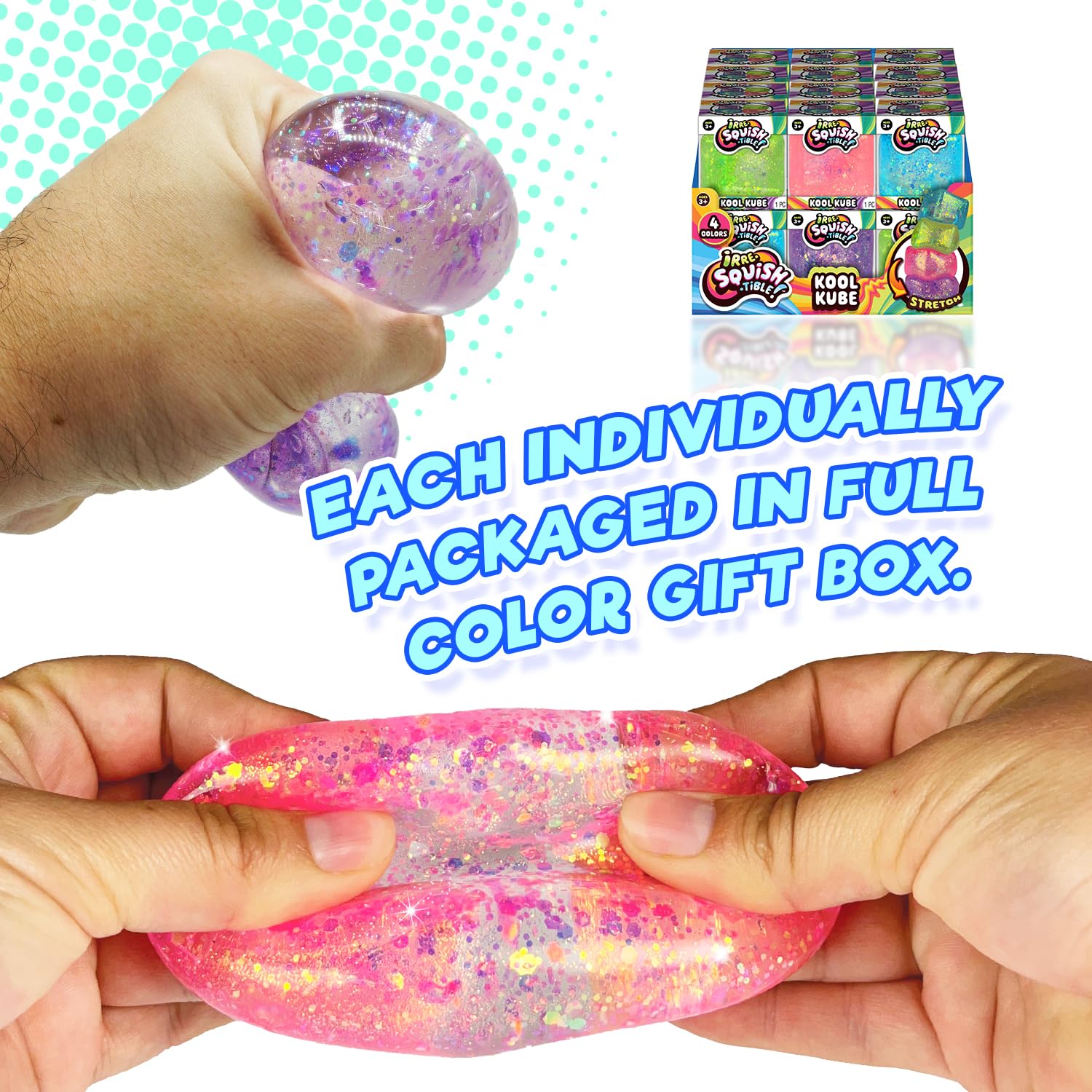 JA-RU Squishy Kool Kube (24 Cubes Assorted) Irresistible Squeezy Glitz Cube Toy for Boys & Girls. Stretchy Ulti-Malt Squish Feel Fidget for Kids Teen & mature-themed. Stress Relief Fun Party Favor. 4542-24