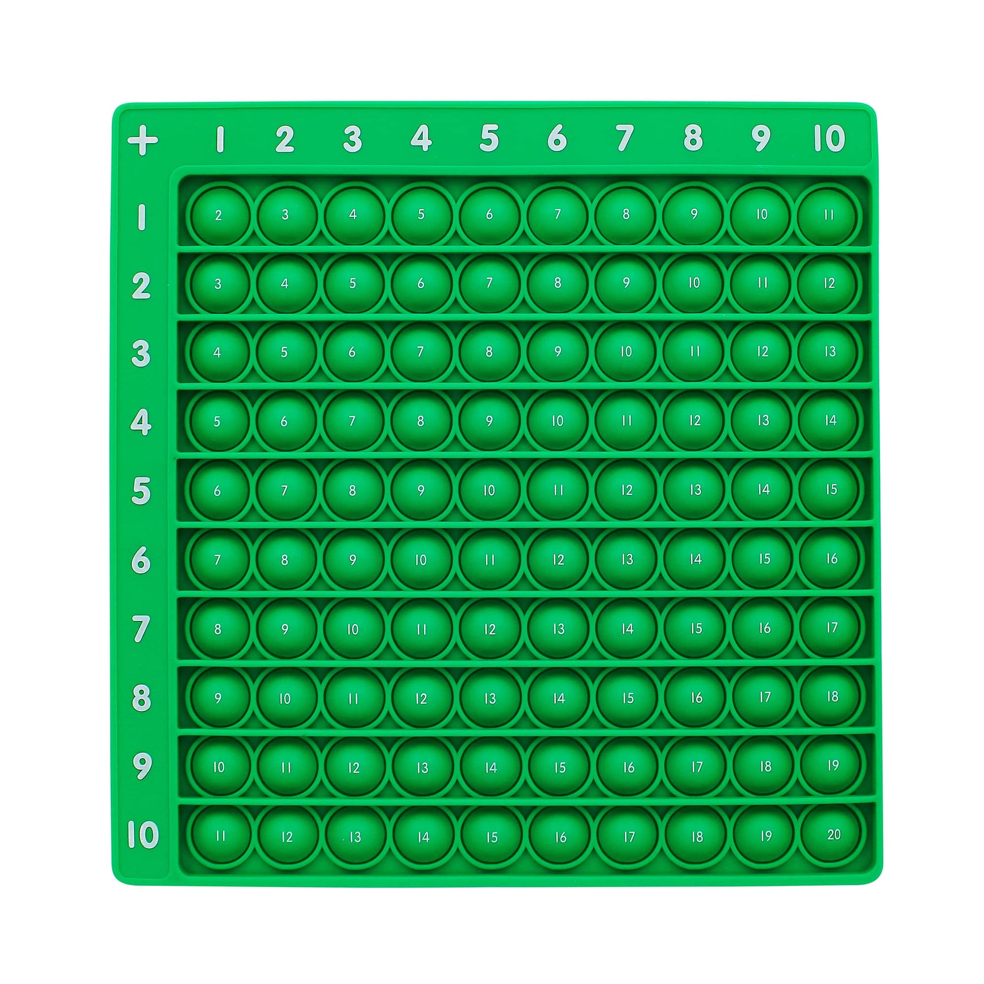 Learn addition facts to twenty with this durable pop and learn addition board. Addends one to ten are represented on both the vertical and horizontal axes with the correct sum presented in the corresponding bubble. Pop bubbles as you practice and solve the equation. Bubbles on the reserve side are blank and can be used for creating visual addition examples.