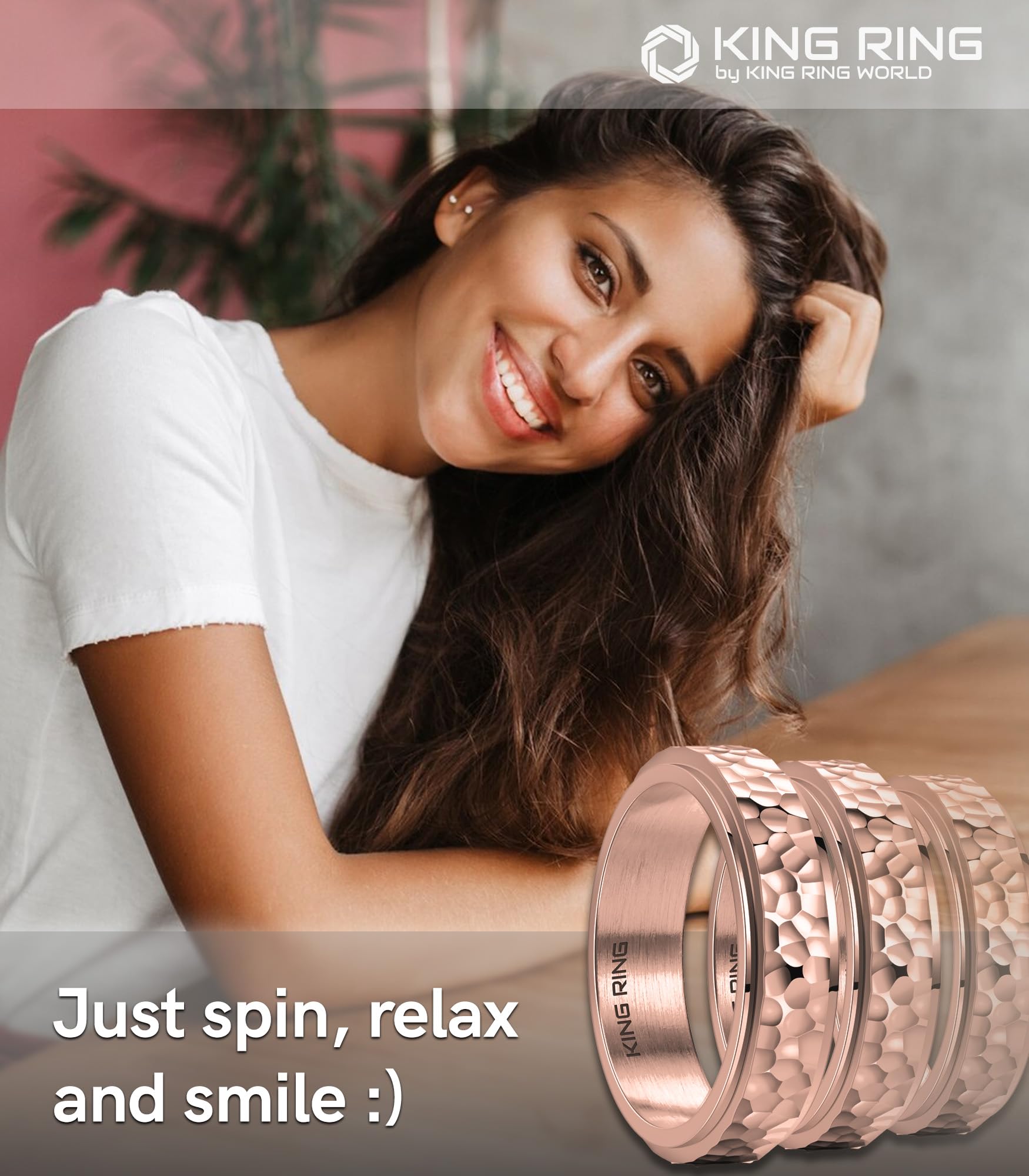 Looking for a stress helper? Stress relief gifts for women & for men? Or do you want to attract attention with a really quality lambent fashion rings for women? Try our King Ring K39 Hammered Spinner Ring now. We mill each product from a single piece of solid 304S steel before carefully shaping & polishing to a stunning, mirror shine, producing an exquisitely finished spinning ring thats completely scratch, chip & tarnish resistant & will retain its stunning shine day in, day out! You can choose any of many colors for your current mood or for any occasion of your life. We did it for you with love.