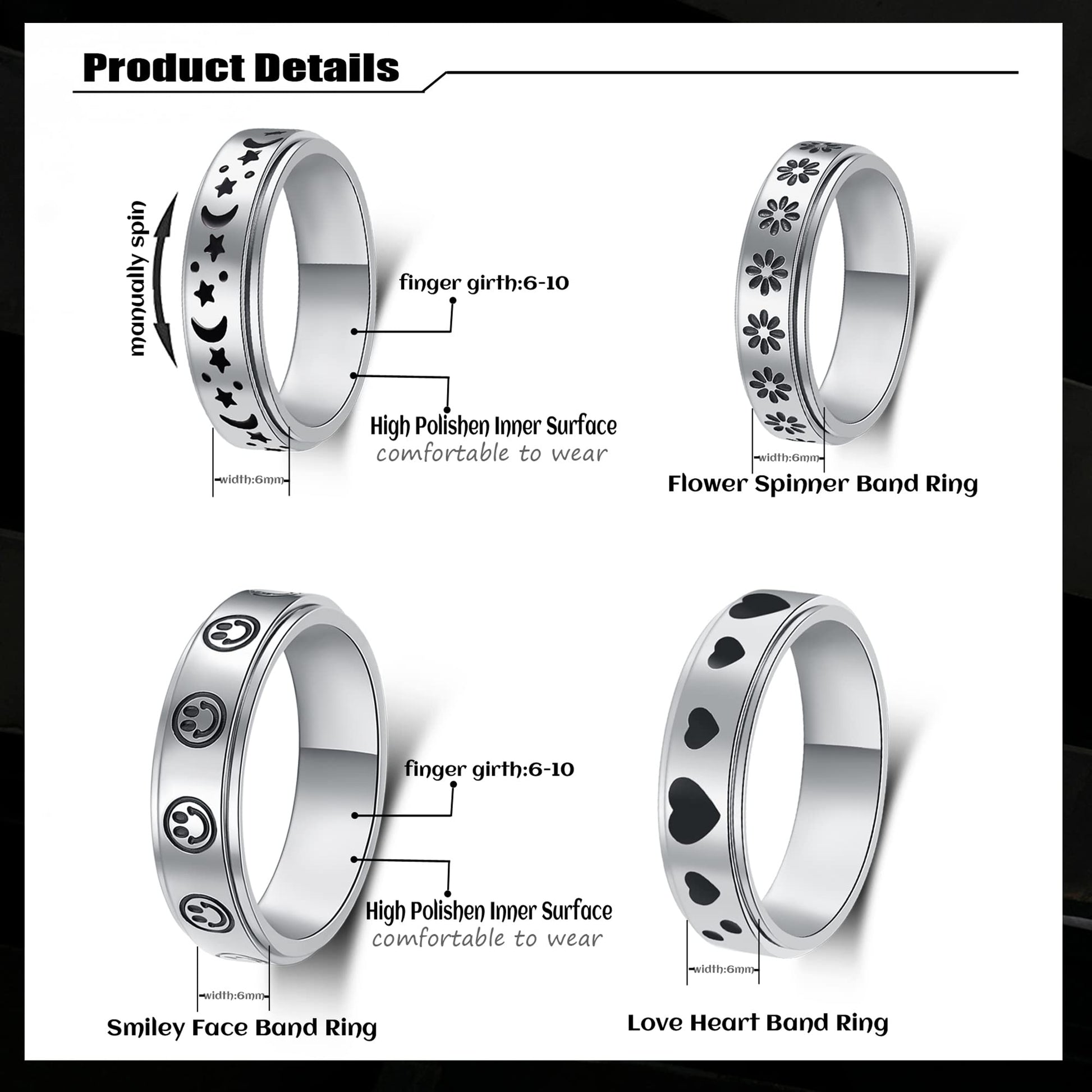 - Q: What is a fidget spinner ring and how does it work? A: A fidget spinner ring is a type of ring designed to help alleviate anxiety and stress through its spinning motion. The LuckyAmor Spinner Ring features a unique design that allows the outer band to rotate smoothly, providing a tactile way to relieve tension and enhance mood.