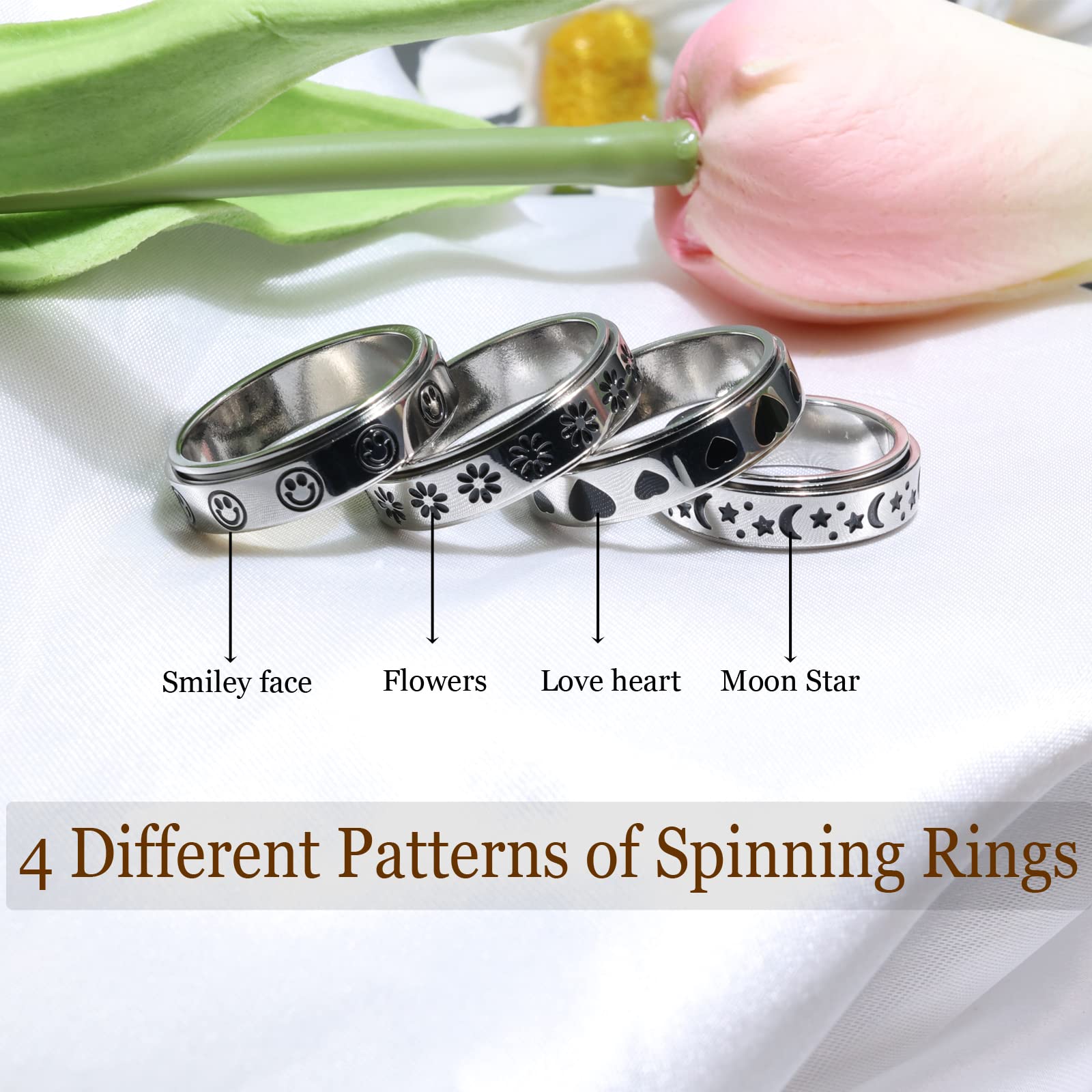 SPINNER RING FOR WOMEN>>>Moon Stars Spinner Ring----The Ring Has the Same Bearing Just Like the Windmill,Gets you through stress,anxiety and enhances your mood;Unique,handcrafted stainless steel ring, Beautiful Decorating Band Ring,Also an Anti-Anxiety Rolling Toy That No One Will Find Out. | PREMIUM QUALITY >>>:Width:6.0mm(15/64''),Size:5 6 7 8 9 10 11,Handmade Mirror-shiny finish;Our spinner rings are made of High-quality and Safe material stainless steel;Solid,sturdy and durable;Hypoallergenic.Best plating technology Never turn your finger green. | UNIQUE DESIGN>>>:Gently rotate with your thumb,and can rotate 2-3 laps smoothly.sand blast finished,hollowed moon and star outer band, gold silver rose gold black rainbow blue color available. | MEANINGFUL>>>:The fidget spinner ring comes with a velvet bag.Great Gift for your Wife,Daughter,Mom,Aunt, Sister or Friends like mother