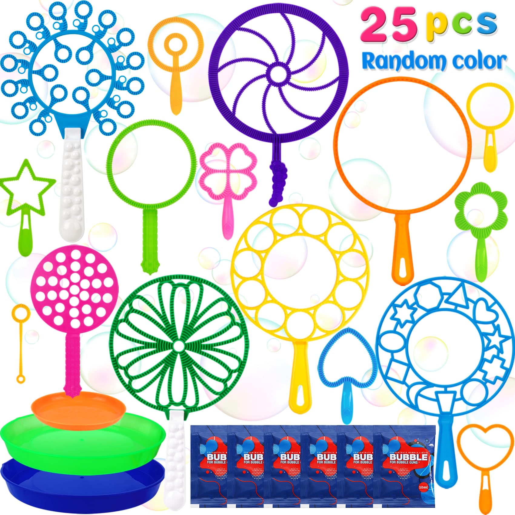 25PCS Big Bubble Wands Set, Giant Bubble Wands Toys Bulk with Tray Bubble Solution Funny Bubbles Maker for Kids Adults Summer Outdoor Activities Game Birthday Gifts Bubble Party Favors Product Specification: Package: 6* large bubble wands 2* medium bubble wands 8* small bubble wands 3* bubble trays 6* bubble concentrate solution Color: Multi-color bubble wands Material: Plastic Easy to Play: Dip a bubble stick of different sizes into the bubble solution, gently blow or wave it on air to create bubbles of different sizes. For All Ages: With bright colors and different sizes, kids and adults can enjoy the funny bubble time.
