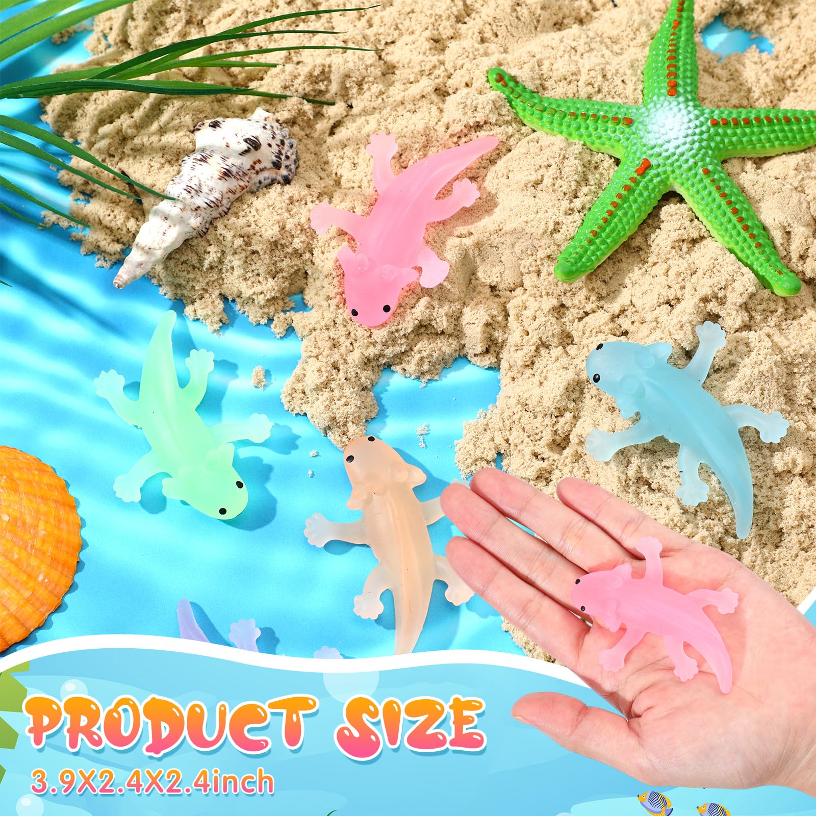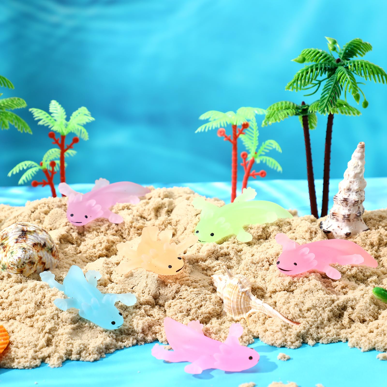 Features: The mini axolotl toys are brilliantly designed in transparent blue, orange, green, pink and purple, a total of 5 colors that are noticeable and appealing in appearance. This beautiful array of colors, livens up any setting, making it a delightful gift for anyone who appreciates unique items. The package features 30 cute mini axolotl figures in 5 different colors and 3 varied styles, offering a good variety to choose from. This variety extends the use of the toy from being a simple stress relief tool to an exquisite table or tree ornament, adding fun to your space. Specifications: Material: Axolotl toys: TPRFish tank card: 300g coated paperColor: Axolotl toys: transparent blue, orange, green, pink and purpleSize: Axolotl toys: about 3.35 x 5.91 inches/ 8.5 x 15 cmFish tank card: about 5.91 x 5.04 inches/ 15 x 12.8 cmPackage includes: 30 x Axolotl toys 30 x Axolotl cards1 Sheet of double sides adhesive tapeNotes: Manual measurement, please allow slight errors on size. The color may exist a slight difference due to different screen displays. Suitable for people over 6 years old, and its recommended to use under the supervision of adults in case of choking risk.