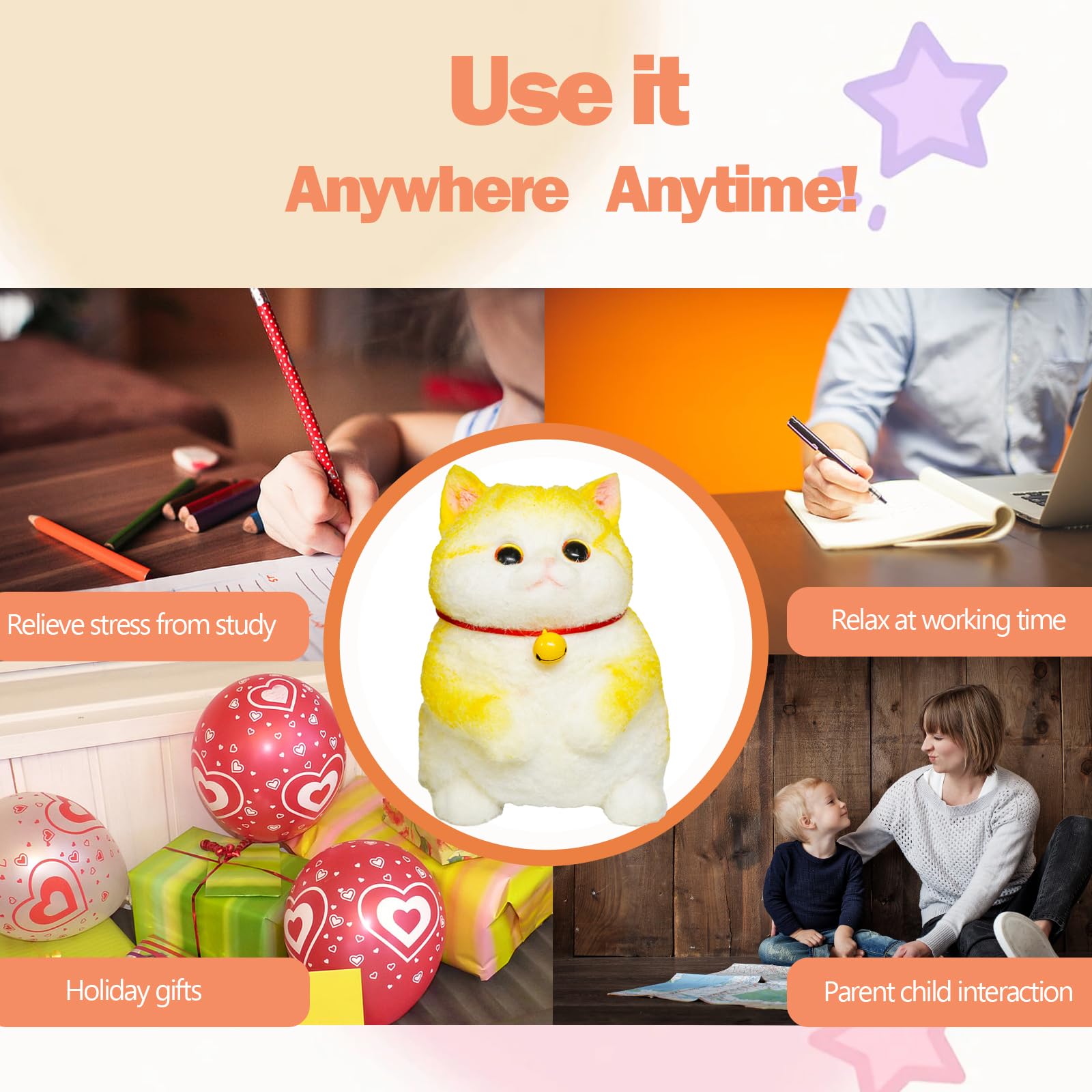 Super Cute and Chubby Cat Squishy: The size of this big taba squishy is almost like a real kitten, 10cm wide, 12cm high, and weighs up to 720g. It is extremely cute and charming, a perfect decoration that steals the show. | Ultimate Touch: this taba squishy cat is made of TPR material, the hand feel is soft and smooth like a cloud, giving a gentle touch. Squeeze it to relieve all the stress and heal your soul. | Stress Reliever: Whether you are tired from work or in a low mood, squeeze and knead it to vent, effectively relieve stress and regain relaxation and freedom. | Creative Gift: The unique and realistic cat shape makes it an ideal gift for relatives and friends, delivering warmth and joy. It is full of creativity and affection. | Excellent Quality: Carefully crafted. The details are exquisite and realistic. It is durable and does not deform, accompanying you for a long time.