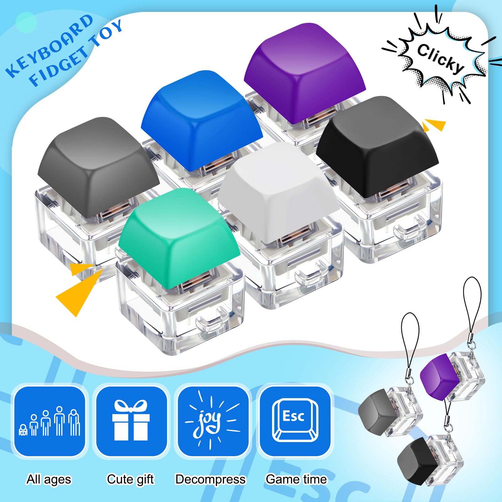 Features: Impress your gift recipient: You can send this mechanical key fidget toy to your friend classmates colleagues as a sweet gift and they will be happy and surprised to receive such an interesting gift. Easy To match: These fidget keychains come with 6 classic colors which can match with your daily outfit and home decorations well saving your time and energy in choosing and matching. Specifications: Main material: PBT Main color: blue white gray black and light green Size: as shown in pictures Package includes: 6 x Clicker fidget toys Notes: Manual measurement please allow slight errors on size. The color may exist a slight difference due to different screen displays. Suitable for people over 12 years old. mature-themeds' supervision is required. Small and inedible items are included please keep them away from young users.