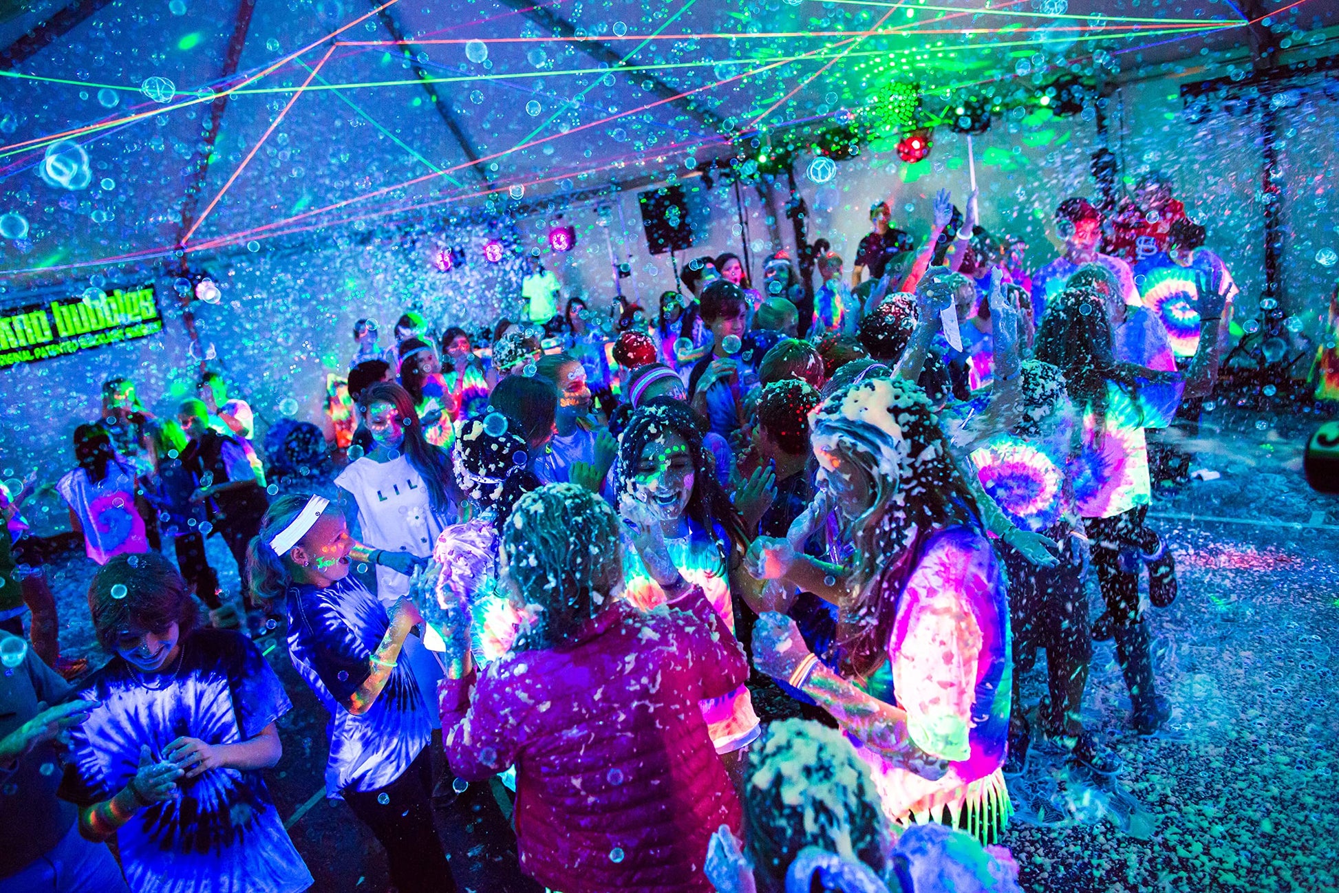 TEKNO BUBBLES are patented, safe non-toxic blowing bubbles that look and act like normal bubbles under regular lighting, yet are unlike any other bubbles in the world. Blue Tekno Bubbles have a beautiful, brilliant glow under UV (blacklight) lighted conditions. Wand not included. Great for Bubble Machines Size: Half Gallon bottle, Color: Blue The key to fluorescence is harnessing the energy of black light - turning invisible light into light we can see. All light is a form of electromagnetic radiation and it has a dual character - behaving simultaneously like a wave and like a stream of particles called photons. The photons we humans can see (the visible light spectrum) is red at one end, green in the middle, and violet at the other end. The colors can be characterized by their wavelength as well as the energy of their photons. Red has the longest wavelength and the least energetic photon, while violet light has a shorter wavelength and more energy. Teknology Just beyond the violet light in the visible spectrum is an invisible ultraviolet light, what is commonly known as black light. TEKNO BUBBLES contain special patented compounds with molecules that emit visible light after absorbing light from an invisible ultraviolet source. When the ultraviolet photons enter fluorescent molecules, some of the light's energy causes the molecules to vibrate. When the light re-emerges, it has less energy and is now within the spectrum of visible light, which in turn causes our patented Tekno Bubbles to appear to GLOW CRAZY WILD! The Staining Question We have found that if people are passing through Tekno Bubbles or are simply allowing the bubbles to settle and pop on them, the bubbles should not stain their clothes. The splatter will be visible in the blacklights until the clothes are washed. Tekno Bubbles could stain clothes when the bubble fluid totally saturates the fabric. This seldom occurs due to the small amount of bubble solution actually pr