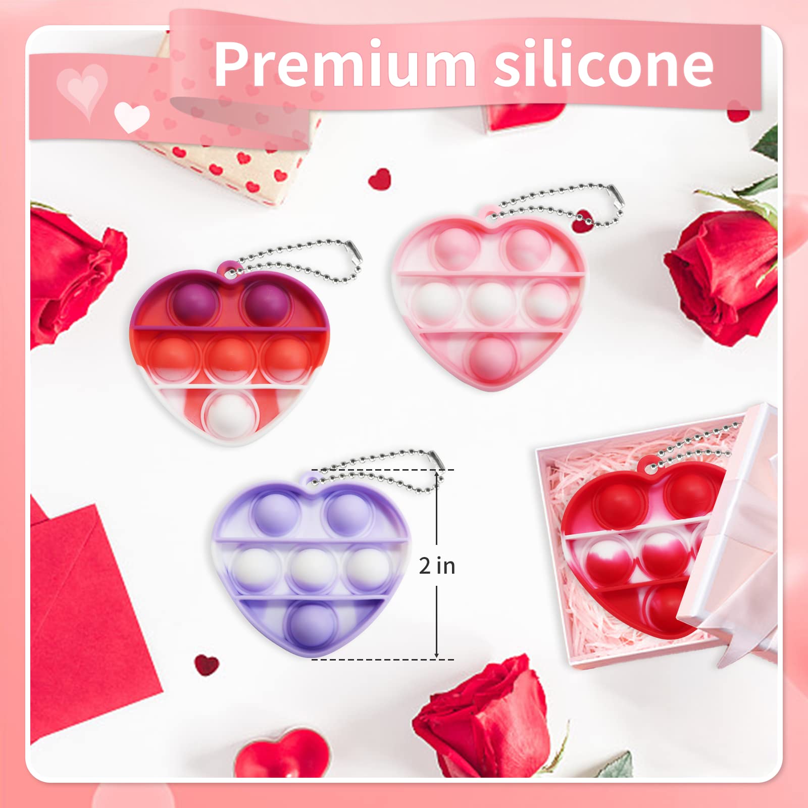 Mini pop fidget keychain toy features: 1. Made of high quality silicone material, 100% BPA free. 2.24 PCS colorful pop keychain toys. 3. Washable and durable. 4. Lightweight and easy to carry.