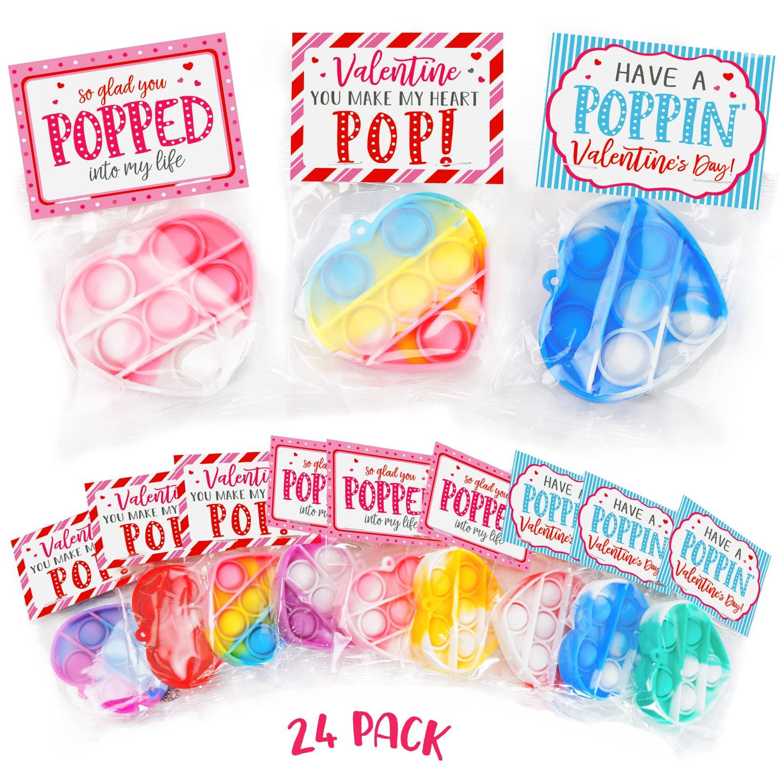 Valentines Day Cards For Kids - Valentines Day Gifts For Kids - 24 Mini Heart Pop Fidget Toys Bulk - Valentine Exchange Cards For Classroom School Party Favors Toddlers Girls Boys Age 3 Year And Up