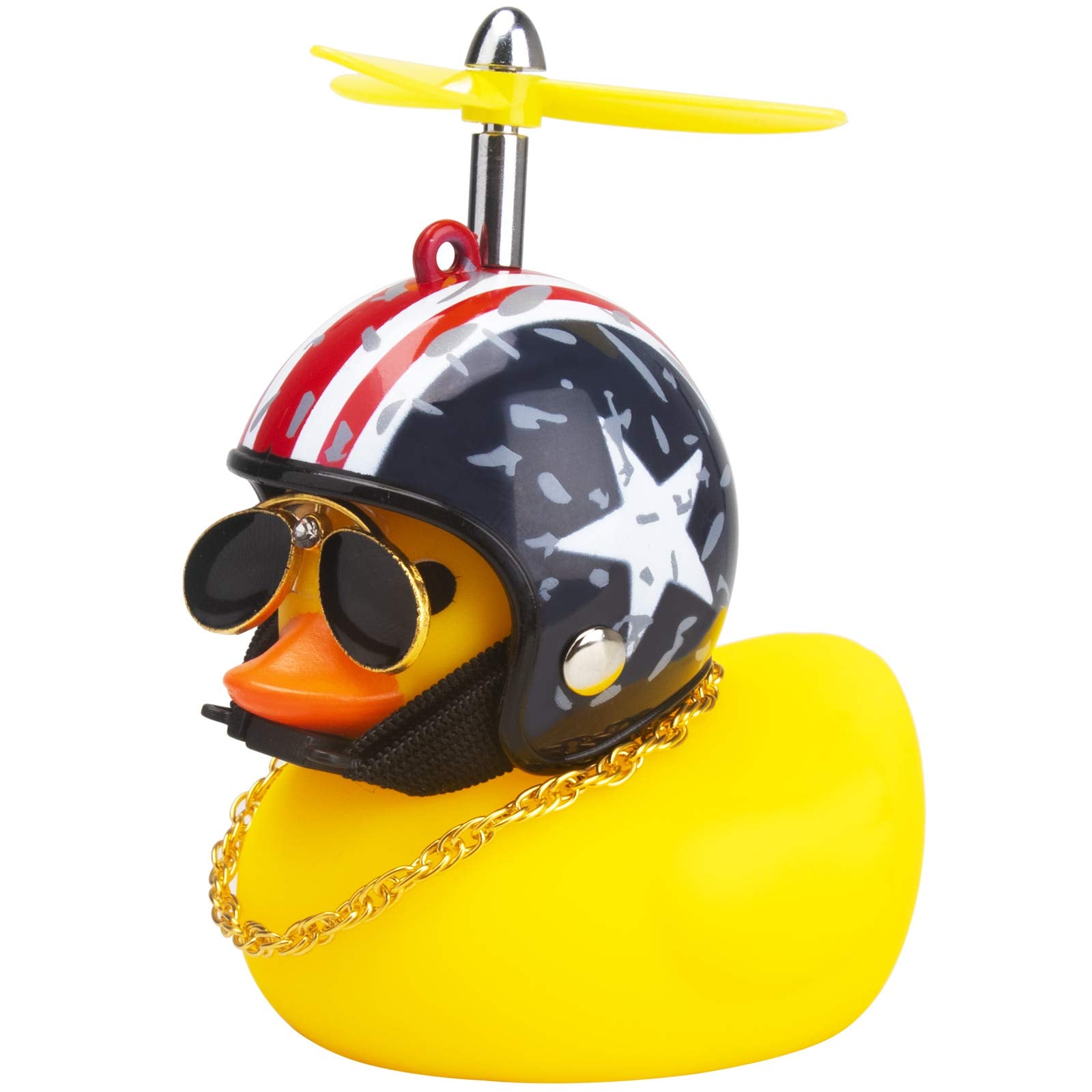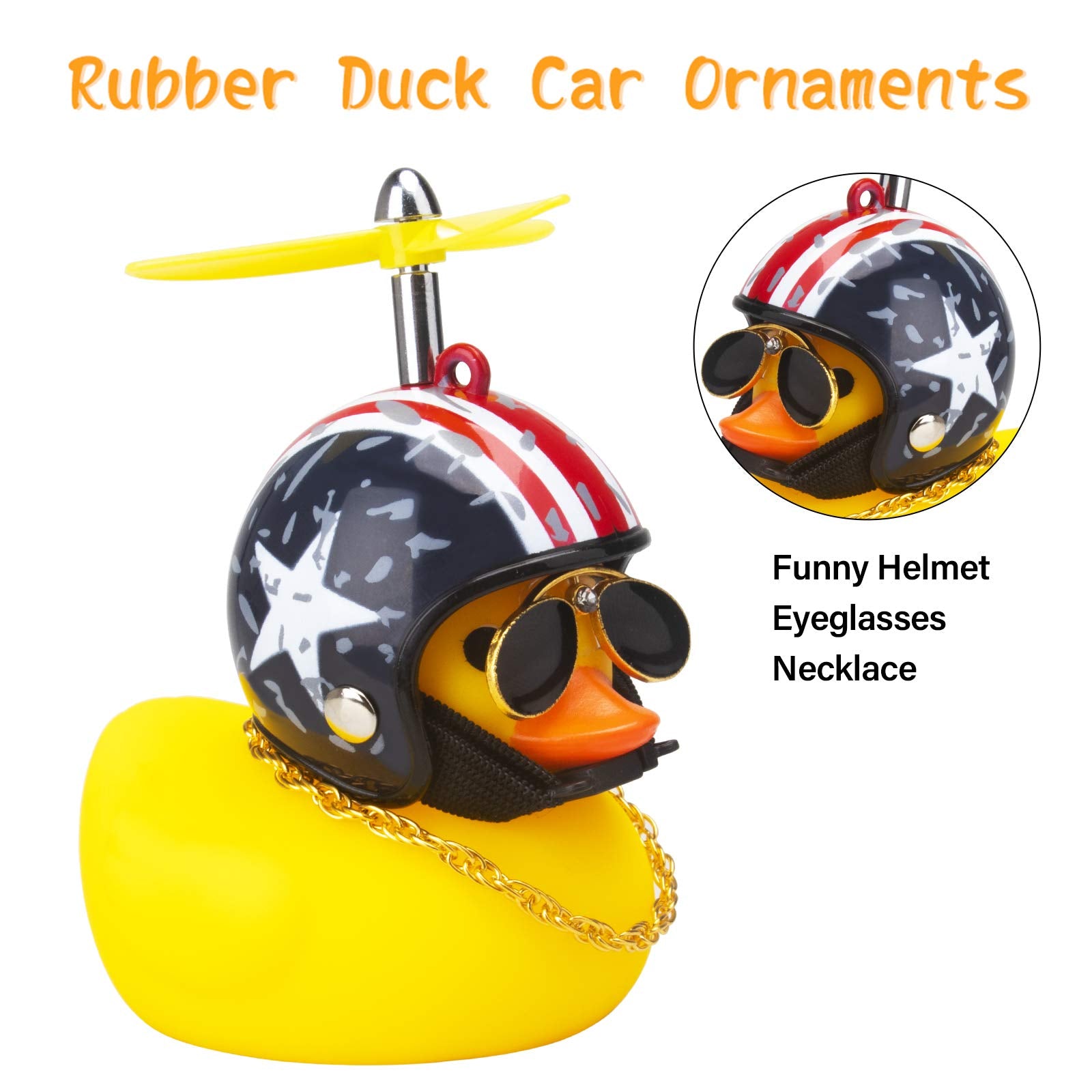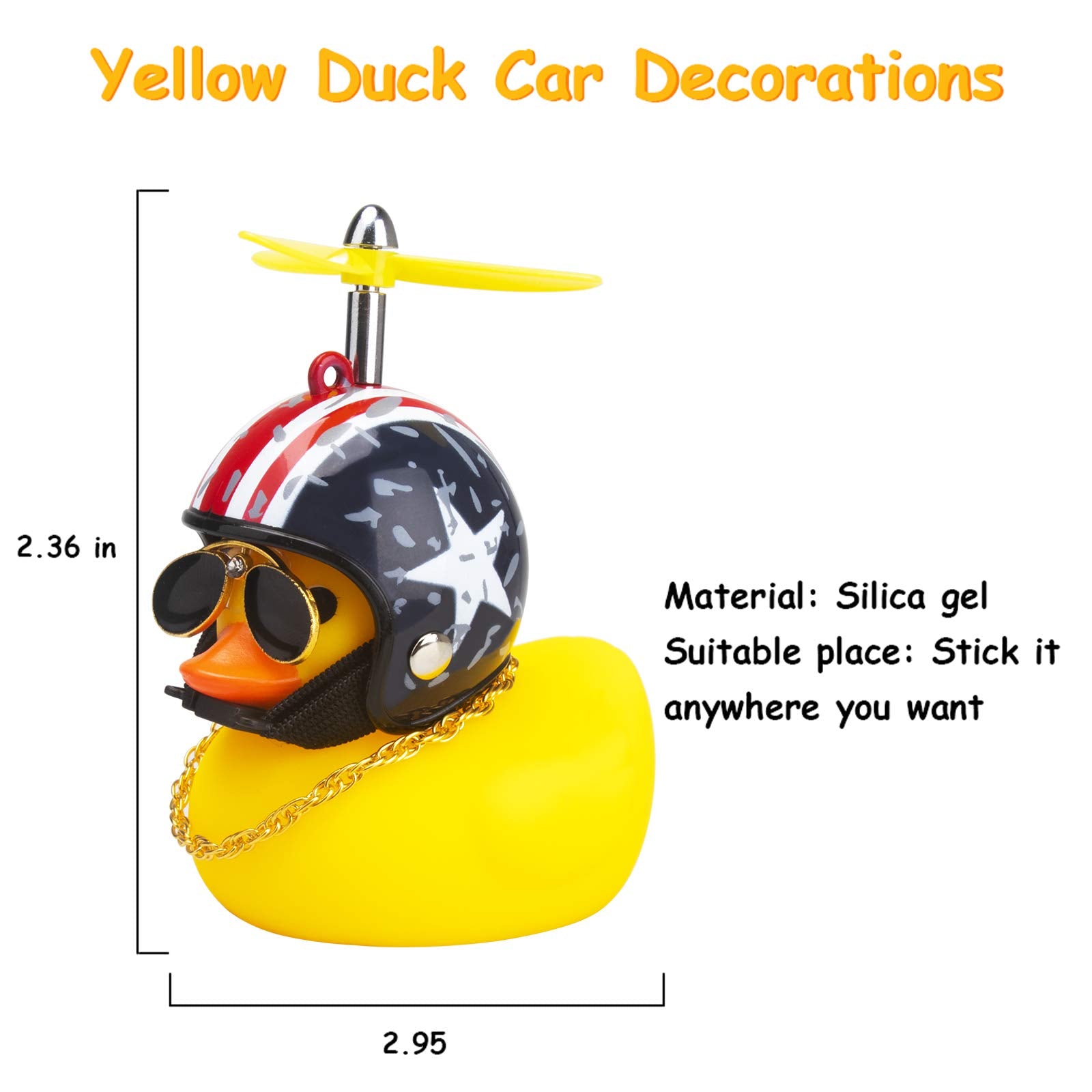 Interesting Car Decorations - The Cool Spectacle Ducks Are Equipped With Funny Helmet, Eyeglasses, Necklace, And The Three Blade Propeller Will Rotate Rapidly When The Wind Blows, A Special And Unique Duck To Decorate Our Car. | Squeak And Funny - These Rubber Ducks Will Make A Squeaking Sound When You Squeeze Them, Which Can Be As A Car Decoration To Add Some Fun During Driving. | Multipurpose - The Rubber Duck Can Be Used As A Car Decoration, But Also As A Relaxing And Pressure-Relief Decoration. Perfect For Decorating Car Dashboard, Desk, Living Room And So On. | Safe Material - Made Of Safe And Non-Toxic Silica Gel Without Any Damage To Us, Yellow Duck Horn Are Smooth, Soft, Flexible, Of Super Good Touching Feeling And Not Easy To Be Destroyed. | Note - Need To Assemble, Put The Gold Chain On The Duck, Install The Propeller On The Helmet, Put The Helmet On The Duck'S Head And Then Fix The Glasses To The Duck With Double-Sided Gummy Material